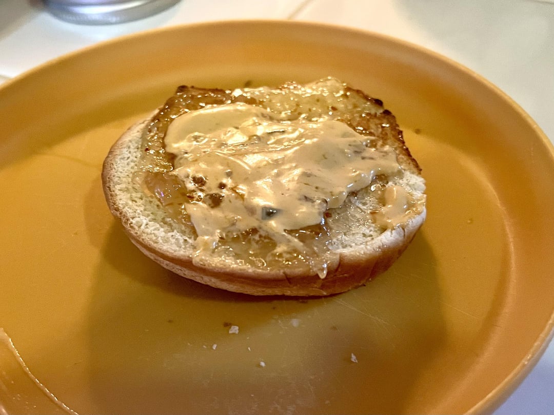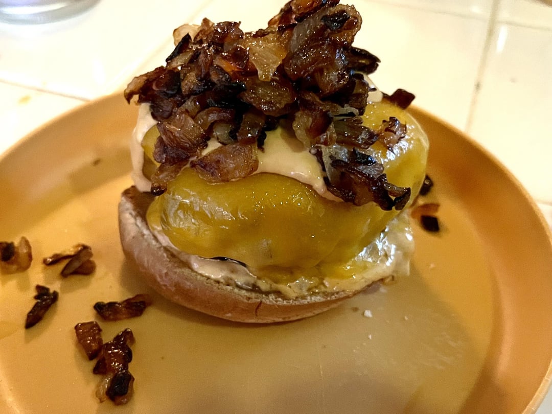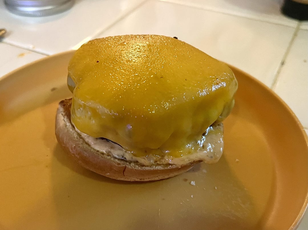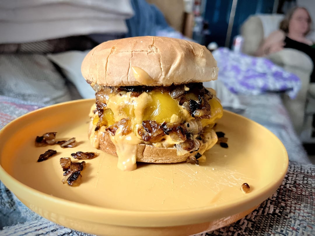 It’s burger night at home. Fairly minimal in terms of condiments. I really wanted to let the gourmet flavors shine. Plain salt & pepper patty with 2 slices of cheddar, on a lightly toasted bun, with maple-bacon jam, burger spread, and a heap of caramelized onion sautéed low and slow. Freaking delicious. I promise.