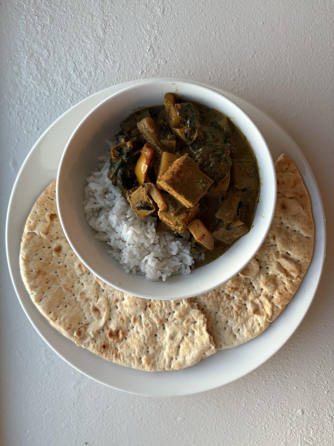 This is curry with potatoes, tofu, spinach, and orange bell pepper. Along with basmati rice and pita bread.