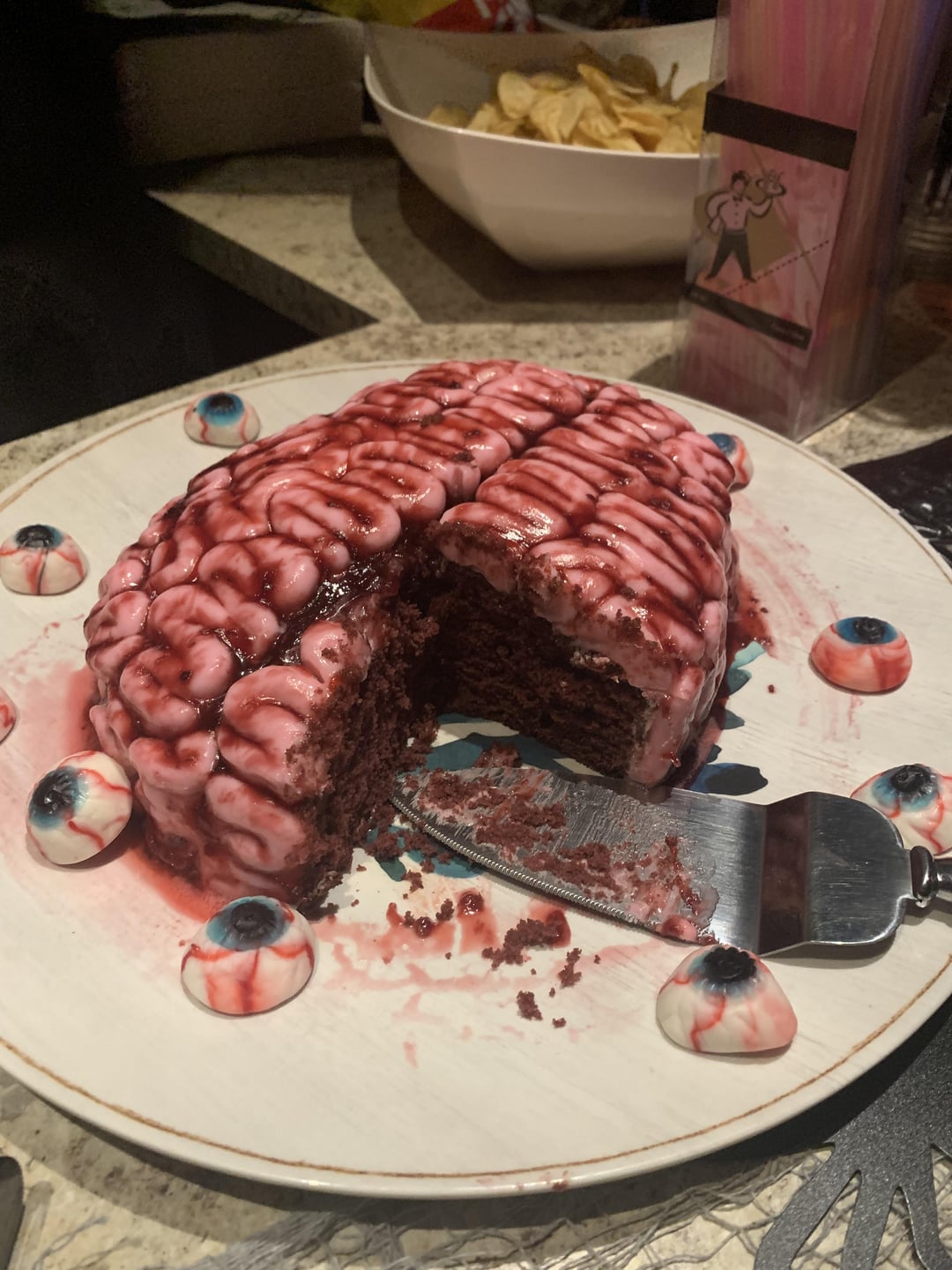 I followed a How To Cake It youtube video which helped so much. I’ll add the link to that below! I used red velvet cake for the inside, rolled pink fondant for the squiggles and topped it with seedless jam. It was yummy but I think people were too grossed out to eat it 😅 That means it worked!