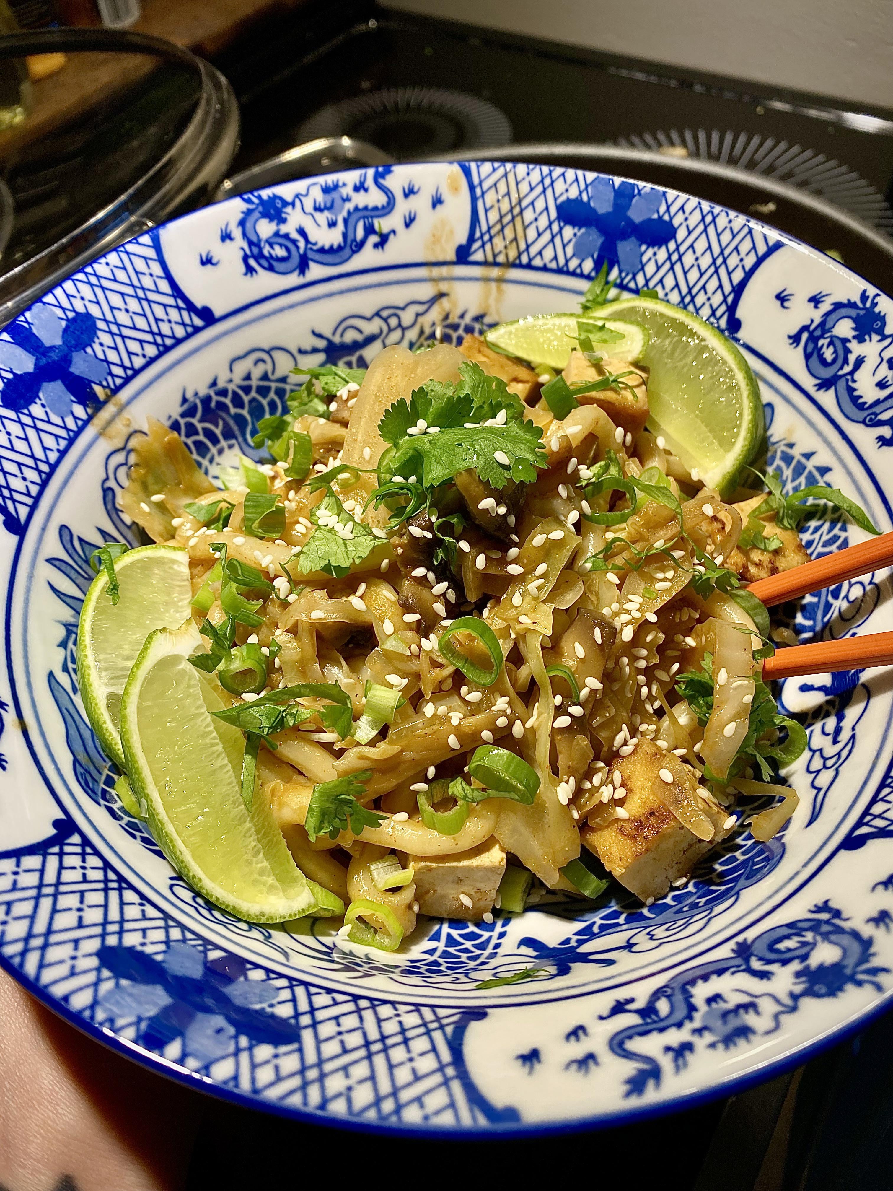 Udon noodles with sautéed veggies (cabbage, onion, mushrooms) and tofu. The sauce is made of soy sauce, PB powder, Gochujang, rice vinegar and maple syrup. Topped with fresh coriander, green onions and lime. Really good!