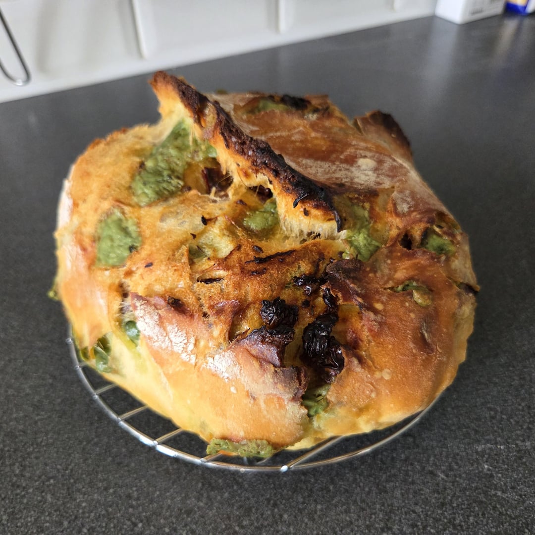 I first experimented with bread with cheese and jalapeños, then mushrooms and mustard cheese, and now this one! Pesto cheese and sun-dried tomatoes.