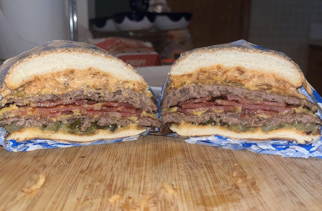 Bacon, American cheese, bread and butter pickles, crispy onions, and homemade sauce. 80/20 ground chuck. Martins bun. Meat seasoned with Lawry’s seasoned salt and pepper.