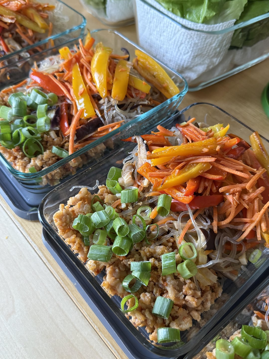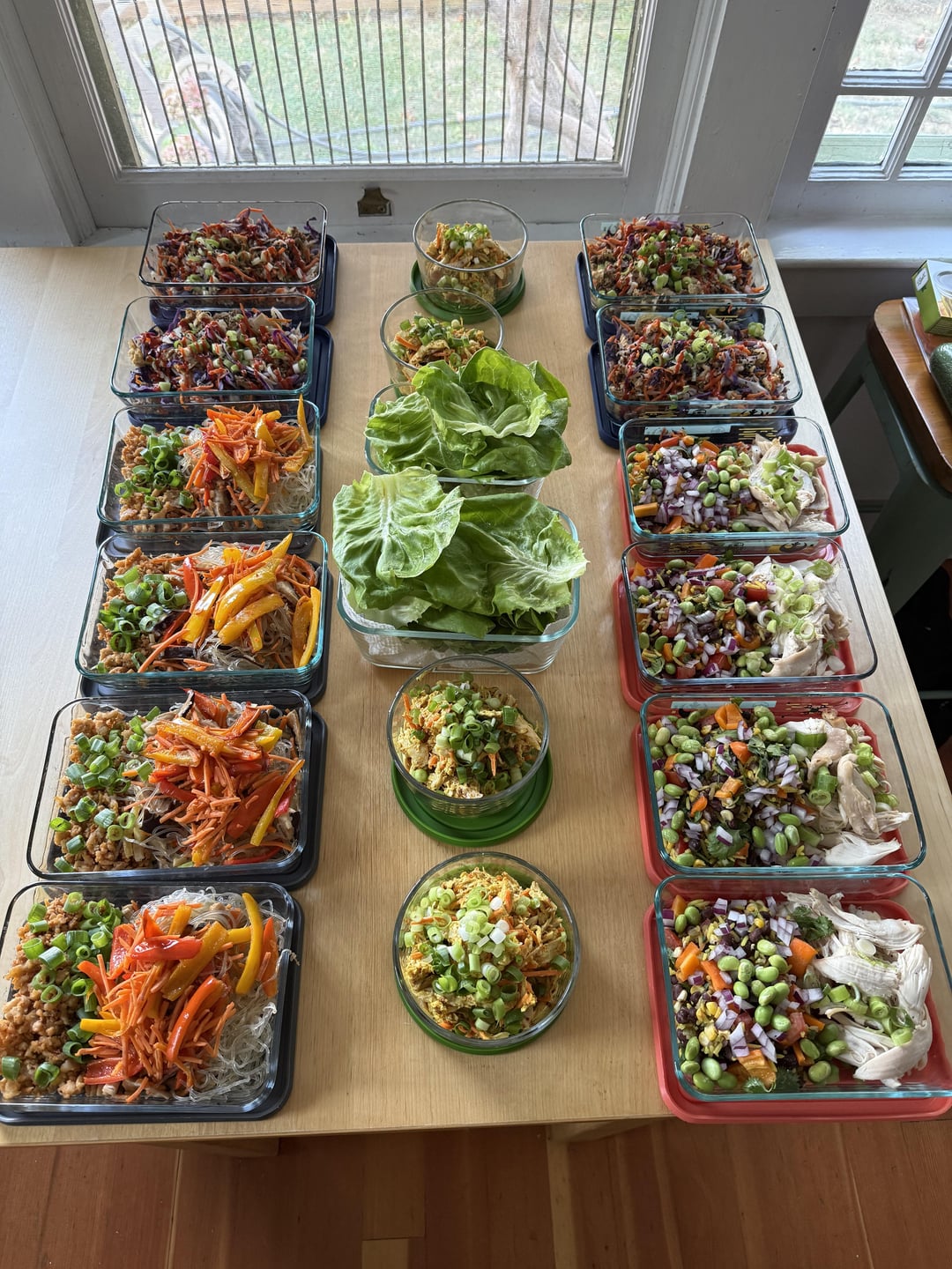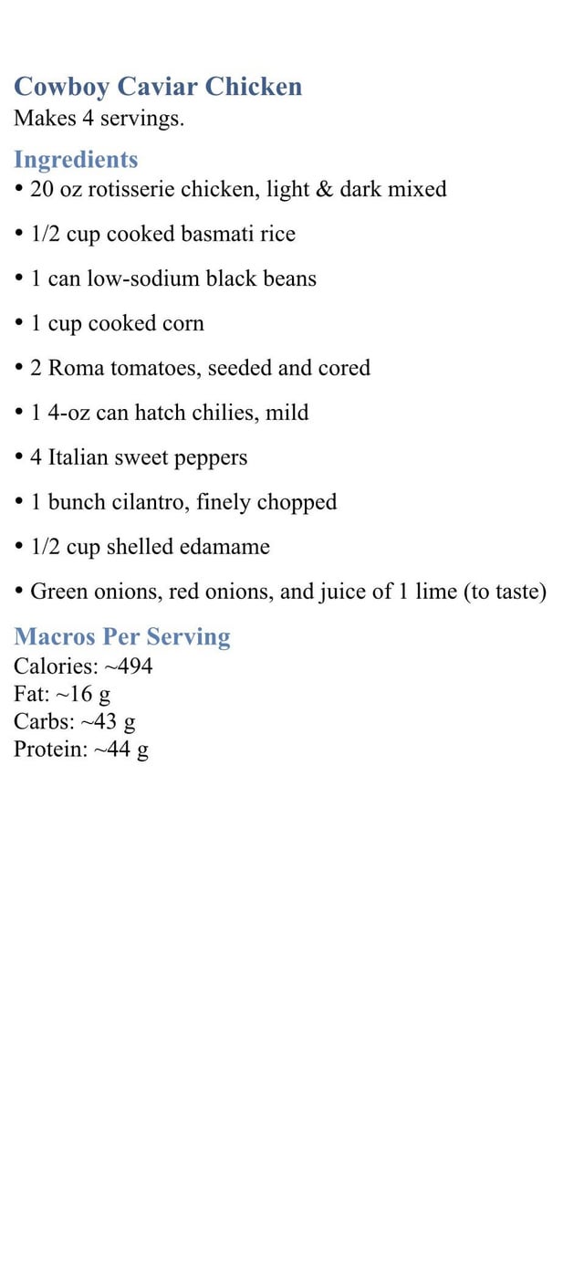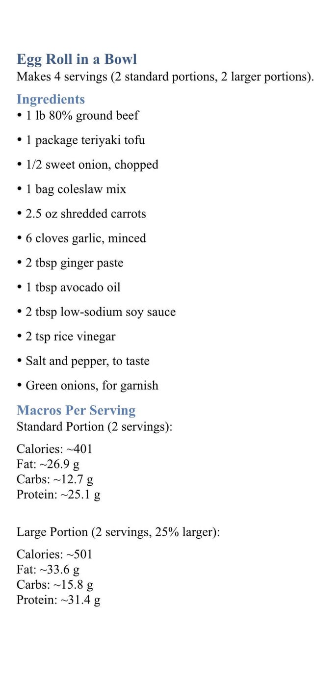 Egg roll in a bowl, cowboy caviar & chicken, a variation on Japchae, curry chicken salad with butter lettuce. My husband’s portions are 25% larger than mine, so some recipes have 2 sets of macros.