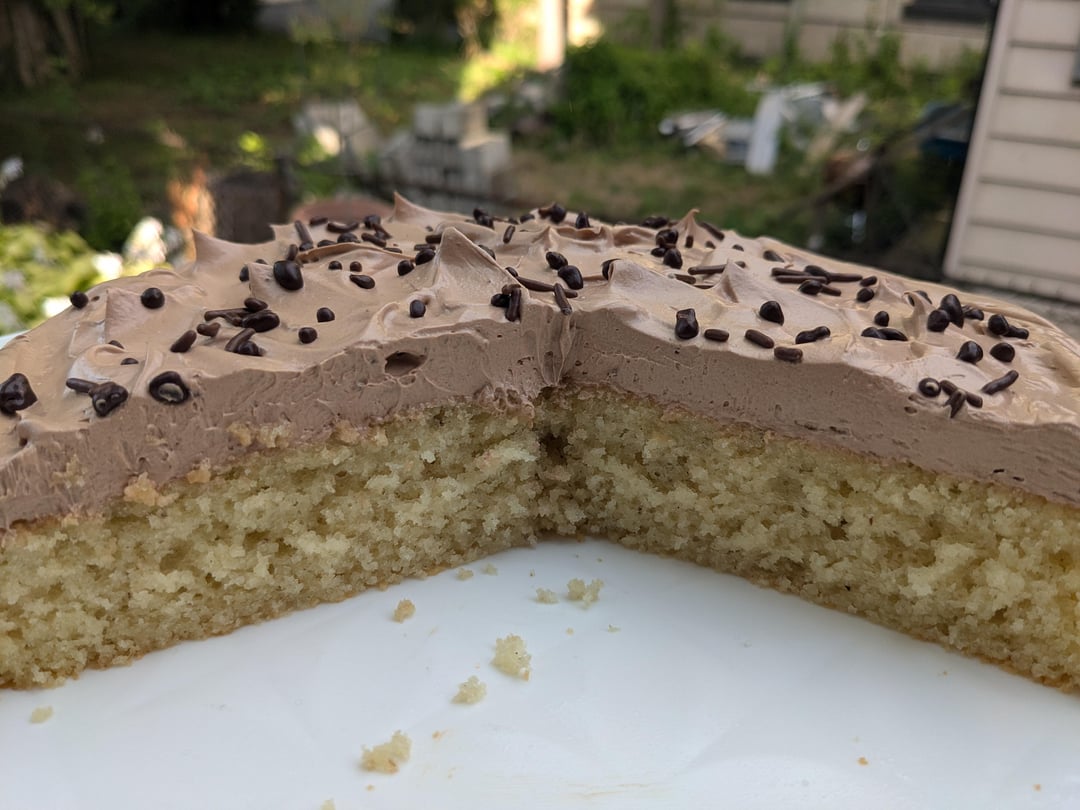 This one is the vanilla cake from Yossy Arefi's Snacking Cakes, and the frosting is chocolate swiss meringue buttercream from King Athur's Baking School cookbook. The preschooler asked for seconds. Well, thirds, but I had to cut him off somewhere.