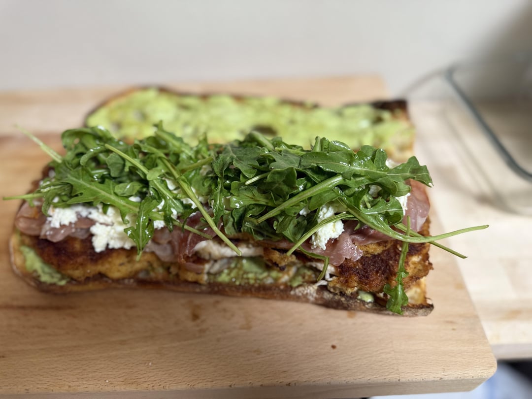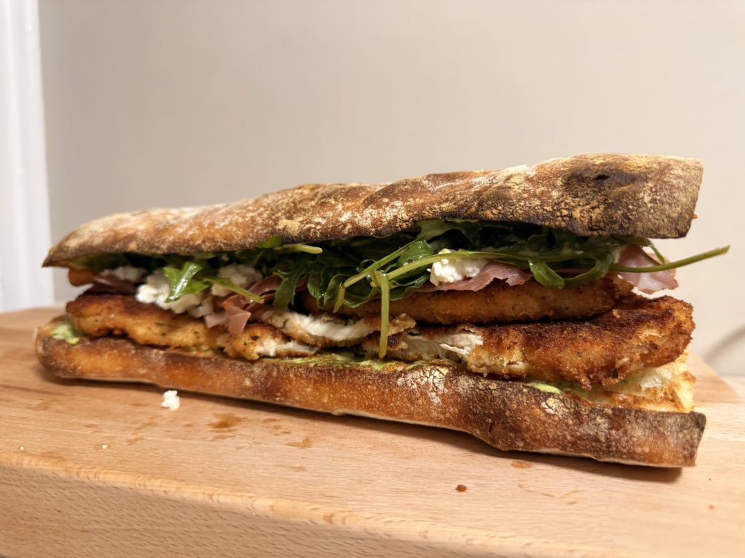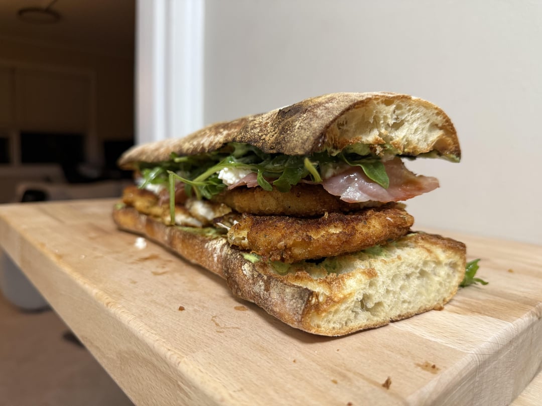 Okay, believe it or not I had like 90% of the ingredients on hand from a previous dish. We’ve got chicken cutlet, prosciutto, arugula, fresh burrata (from my local cheese spot), balsamic, and a “pesto mayo” I kind of winged….(oil, egg, basil, Parmesan, Worcestershire, salt, pep)