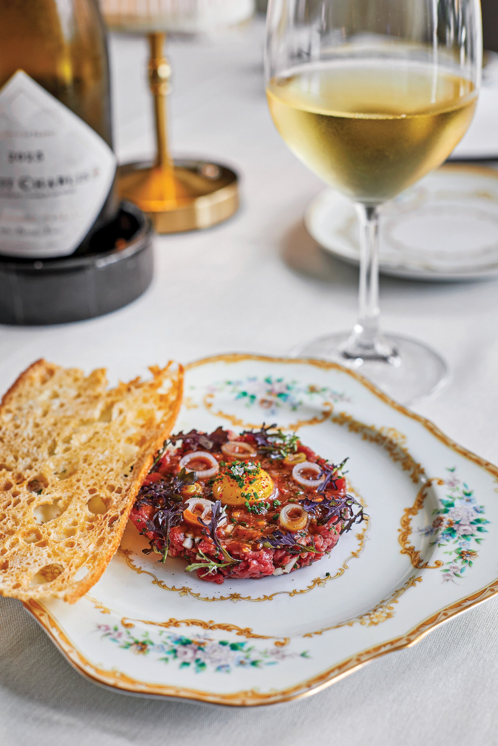 Much of the staff and the dining room remains intact at the seventy-person restaurant attached to Bouchard Inn. The room is neutral — white and beige walls and white leather chairs — save for the modern, eight-person bar that sits just past the doorway in a sleek, midcentury aesthetic. (That vibe extends to the throwback soundtrack that includes a Spanish version of “These Boots Were Made for Walkin.’”)