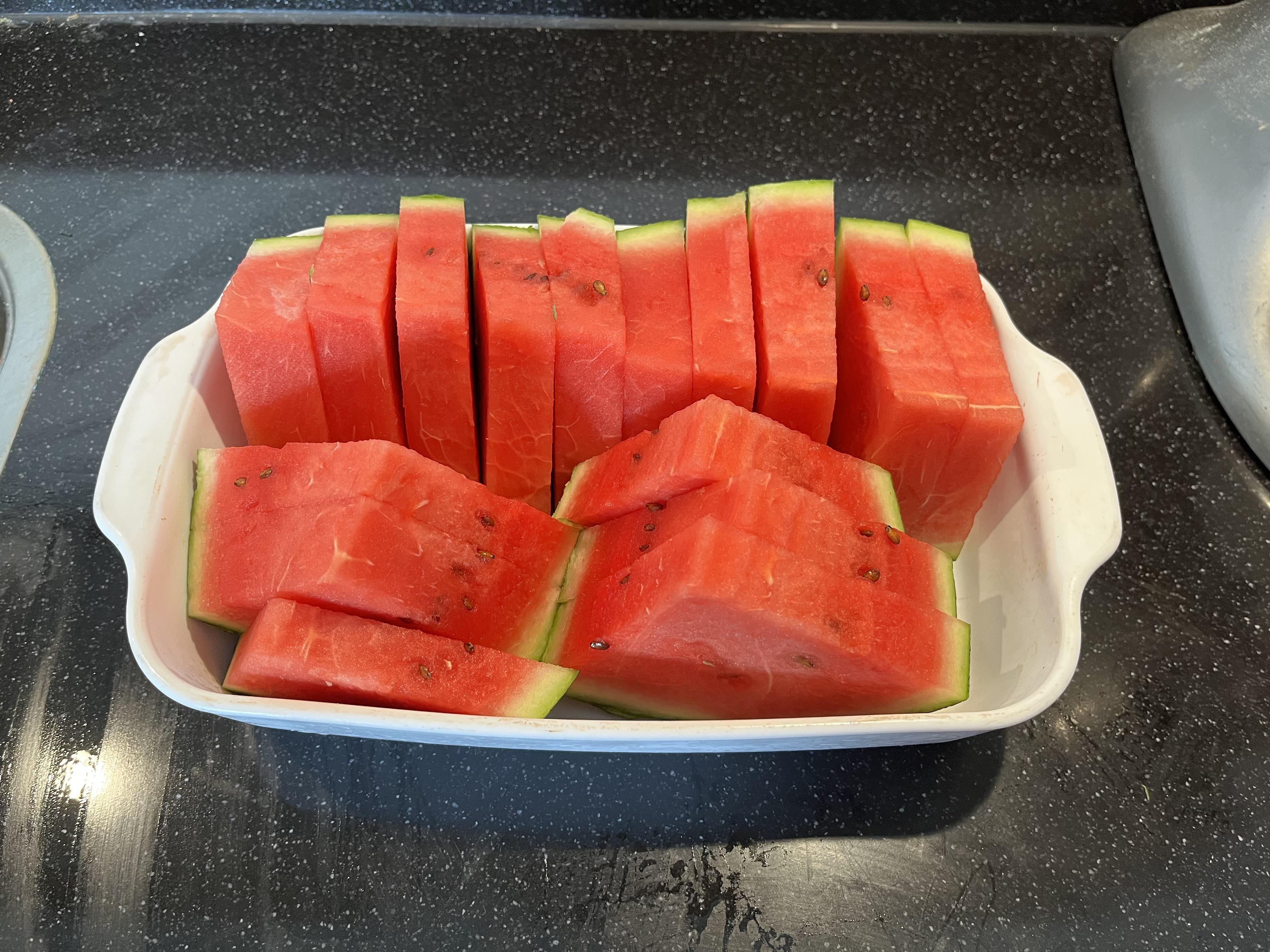 I’m not a fan of heat, but one thing I love about summer: all the fresh fruit. I’ve eaten strawberries, peaches and nectarines already and I’m looking forward to the cherries, but watermelon is definitely my favorite. I live alone, but this will probably all be gone before Monday.