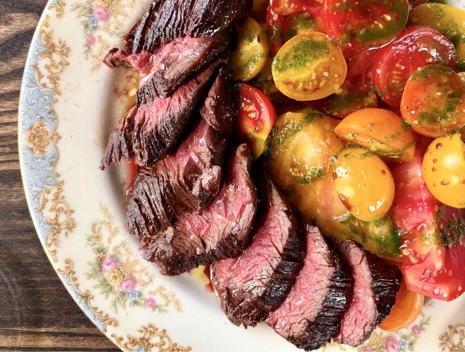 Hawaiian swordfish is griddled and served with green beans, roasted onions, sweet corn and salmoriglio vinaigrette; while roasted prime-grade maccellaio (butcher) steak is accompanied by summer tomatoes, farmer herbs and balsamico di reggio emilia (photo above).