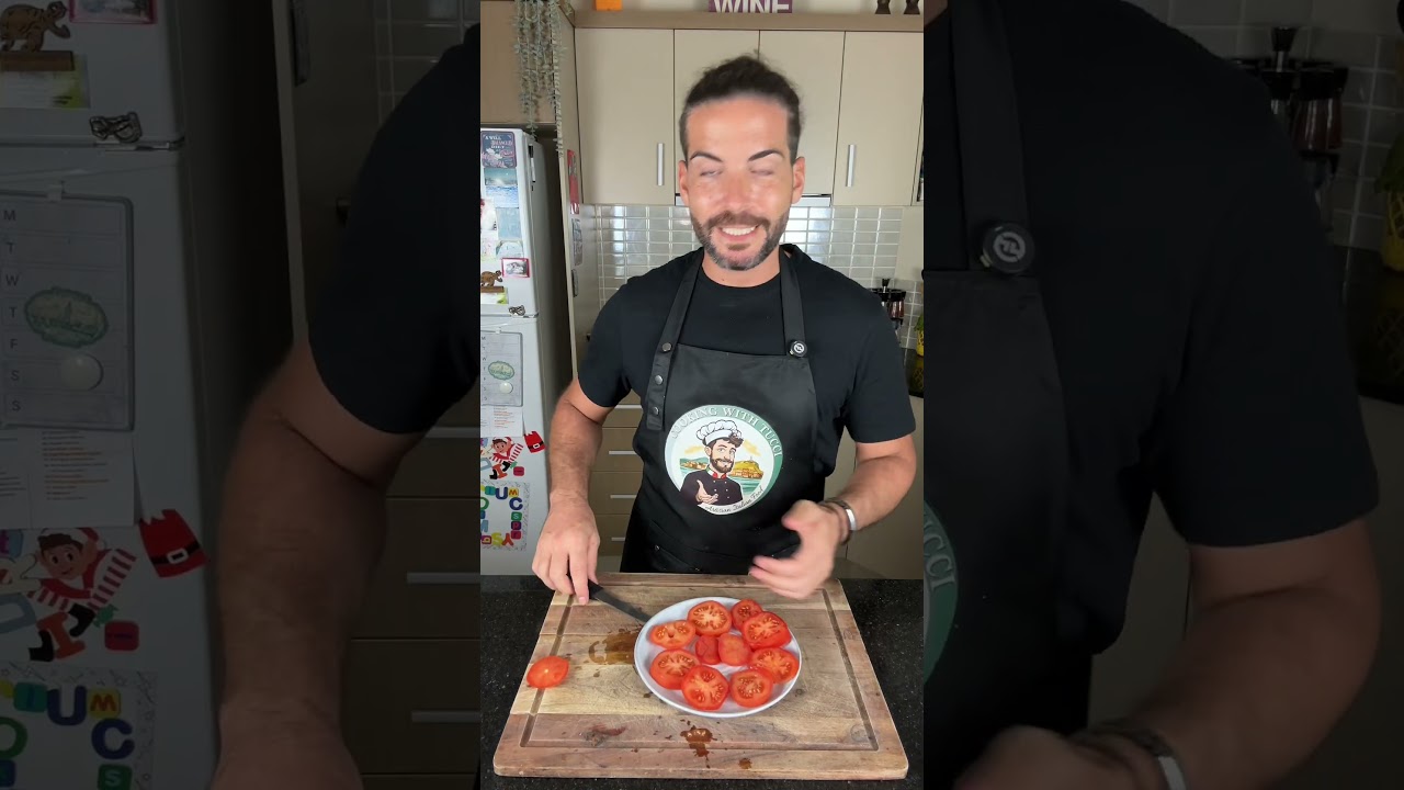 This is for me is the best entry in Italian cuisine. Let’s start from tomato truce or earlon tomato of course wash them. Don’t go too small. Okay. So about this side. Many people don’t eat the top part. I don’t like to waste it. So I use it all. Just like this. Okay. Once we’ve done this, have fresh basil and on each tomato put one leaf. Grab your fresh mozzarella and slice it. And on each tomato, put one mozzarella. Once we’re done, adjust with salt, a good extra vision olive oil, and be generous. I love balsamic glaze, so I’m going to put some on top. And that’s personal. And last but not least, oregano. And now you know how to make capab just like an Italian dough. Ciao.