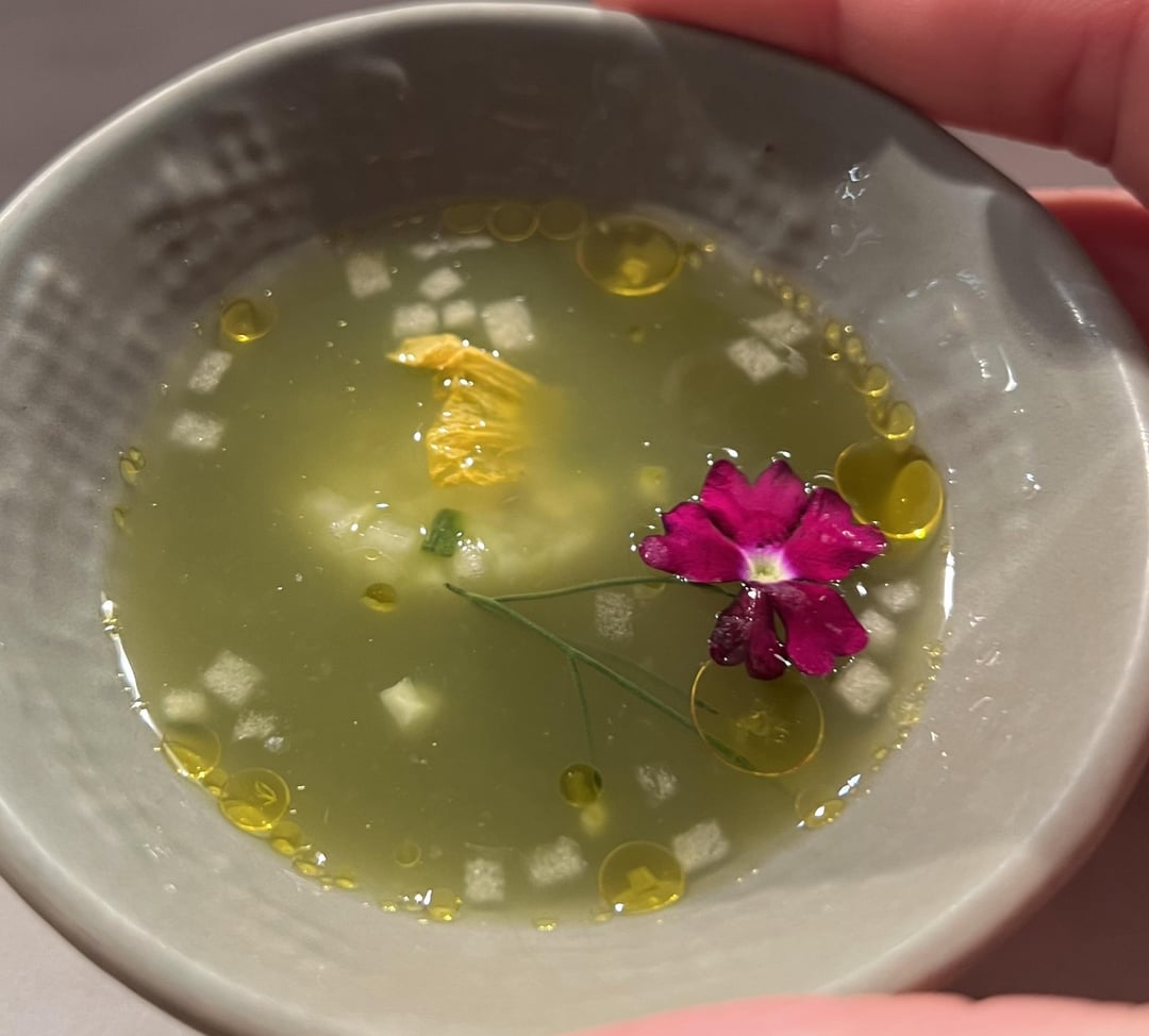3: cucumber and tomato gazpacho to refresh the palate. the clump of diced bits was in the bowl before the gazpacho was poured in. i was told to swirl it quite vigorously so that the bits would all separate but it was a very small bowl (a teacup, really) and despite my efforts (without creating a mess), the clump remained clumped. it was refreshing enough though