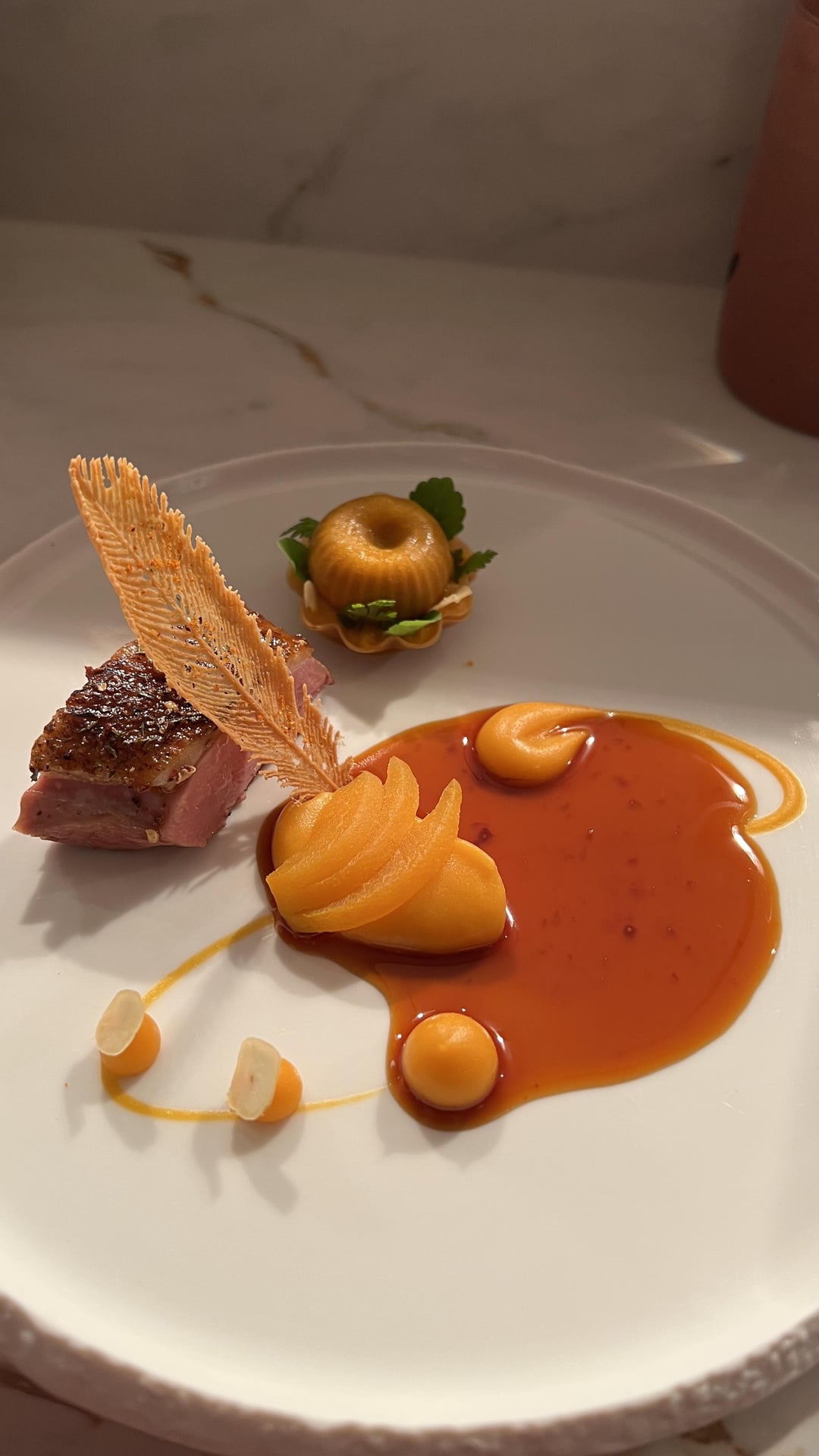 9: duck and apricot, with a duck confit and liver tart. the tart was abysmal. they were either prepping it way too early or there was simply too much liquid in whatever they put in the tart because it was SO soggy. the duck was cooked fine but i would hesitate to call it tender. the apricot was sour and so a little went a long way, which meant that i had a lot of apricot left on the plate after the meat was gone.