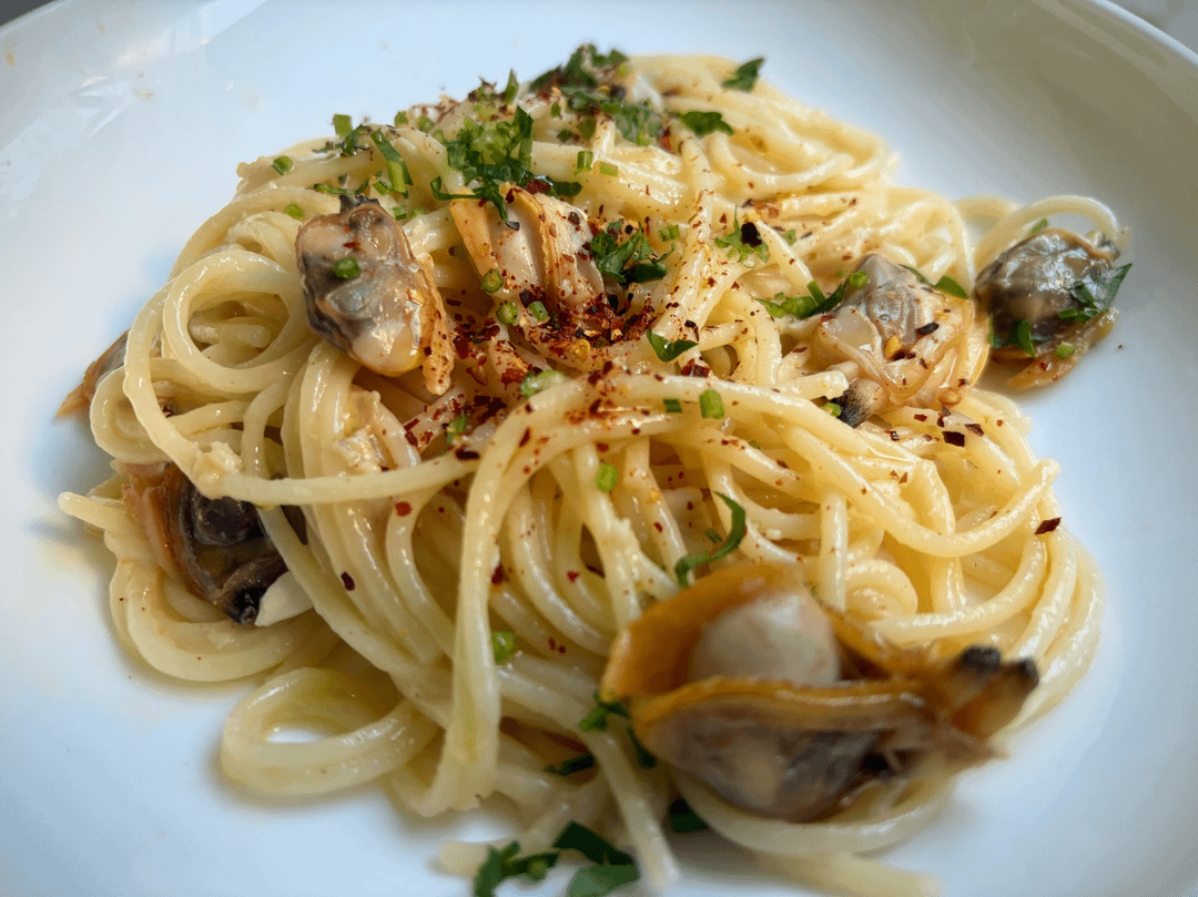Agreeable-Brief6083 2 months ago Cook spaghetti.Clams with water, smashed garlic cloves, olive oil, cover, cook til open.Take out clams, remove some from shells, set aside.Add can of clams (chop clams first) and their juice.Once pasta is almost done, add to pan, along with reserved clams, touch of butter, olive oil, po’ d’acqua, toss.Plate, top with fine chop parsley, rough ground fermented chile flakes.