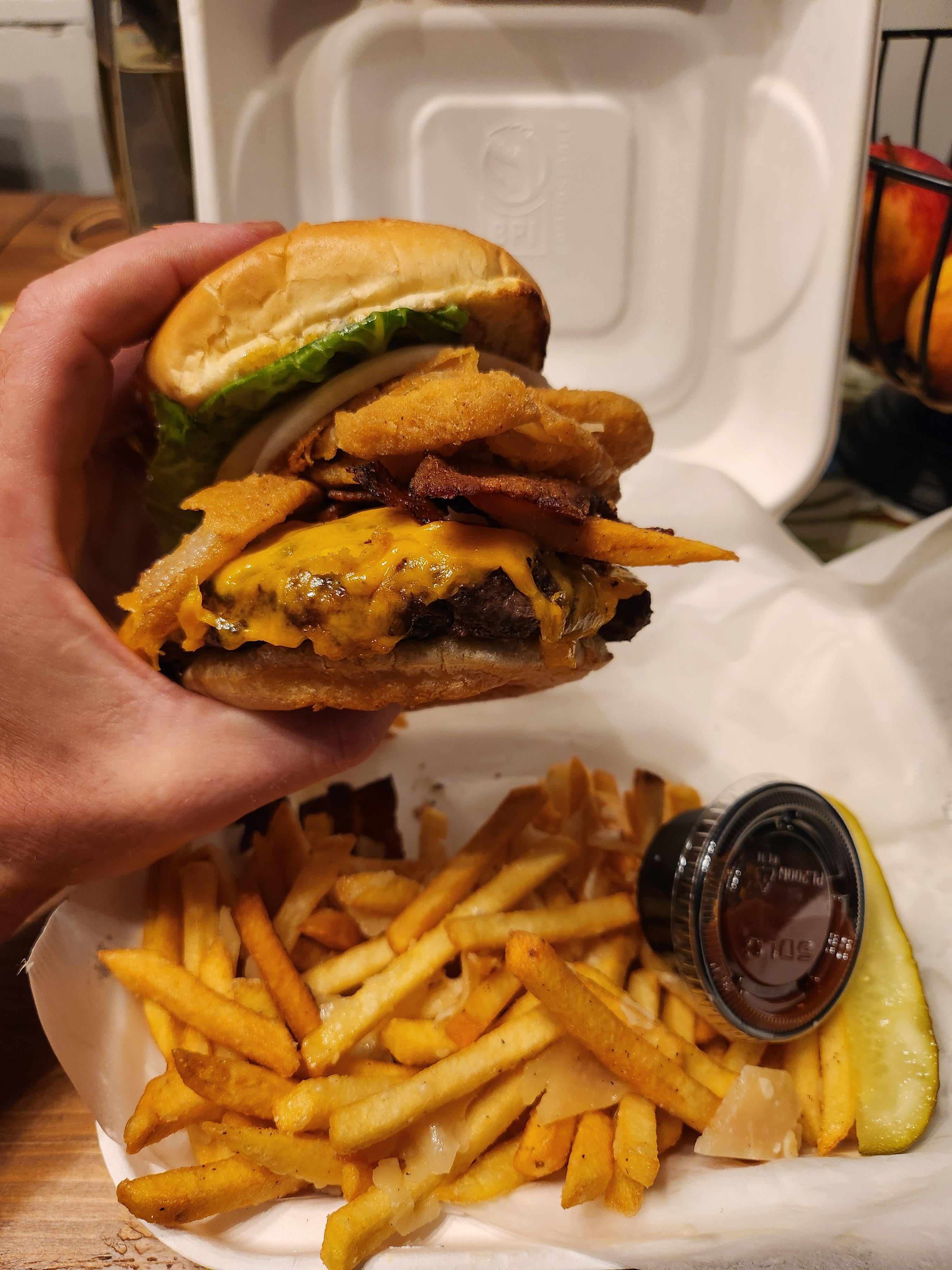 Medium rare, cheddar, onion rings, lettuce, tomato, onions house made BBQ sauce. by downrightblastfamy 6 Comments downrightblastfamy 7 months ago Truffle fries MagazineDelicious151 7 months ago Looks amazing! burberrycondom 7 months ago Fruit? In MY r/burgers? Lucky-Ad-7969 7 months ago Medium rare hmm? An aristocrat Mightnotapply 7 months ago OP where did you get this Familiar_Excuse_9086 7 months ago What fruit?