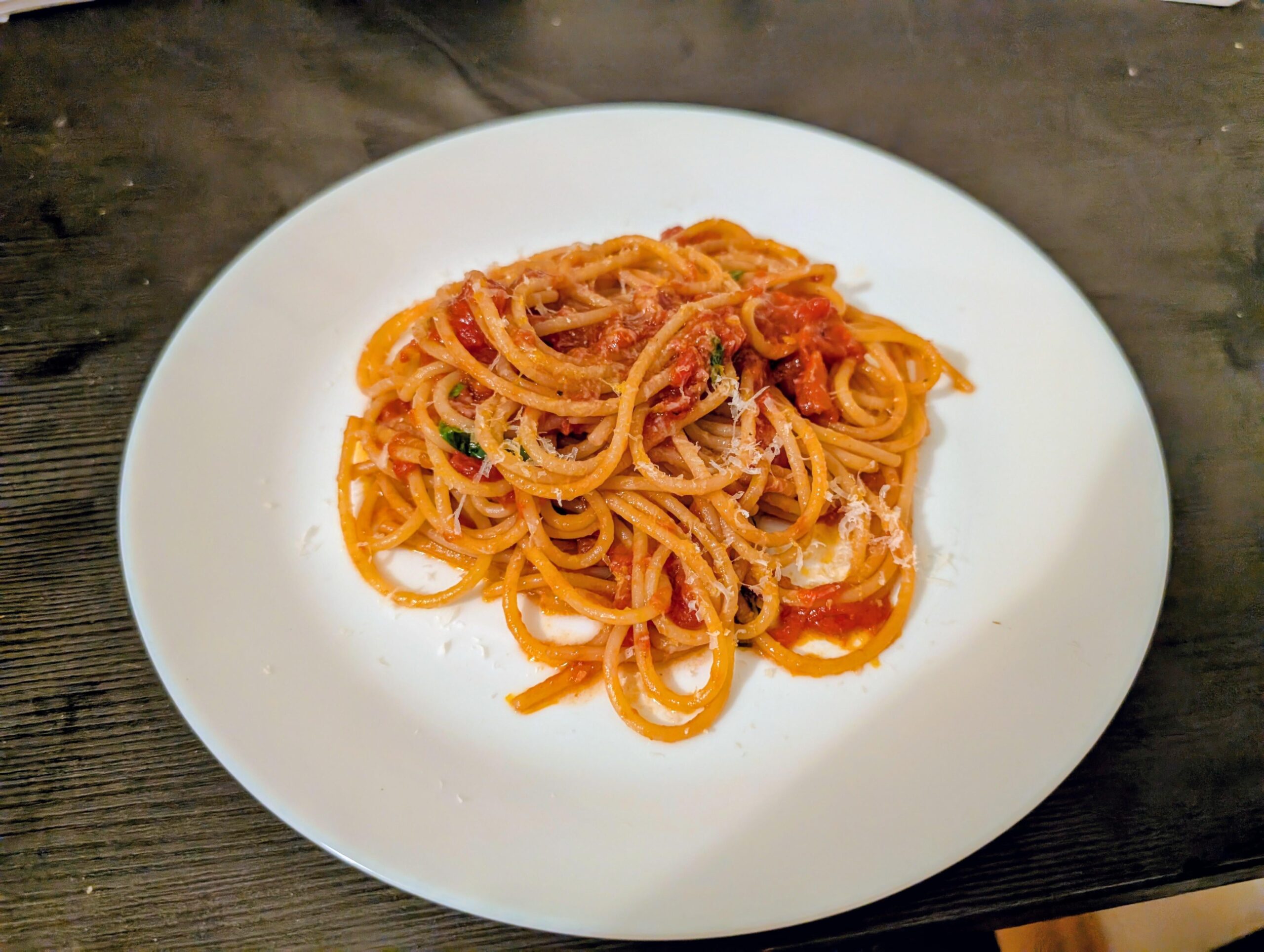Cooked a simple classic for a Thursday dinner. Spaghetti with a quick homemade tomato sauce (olive oil, a clove of garlic gently cooked in the oil then removed, canned San Marzano tomatoes, shredded basil added off the heat). Topped with grated parmigiano reggiano.