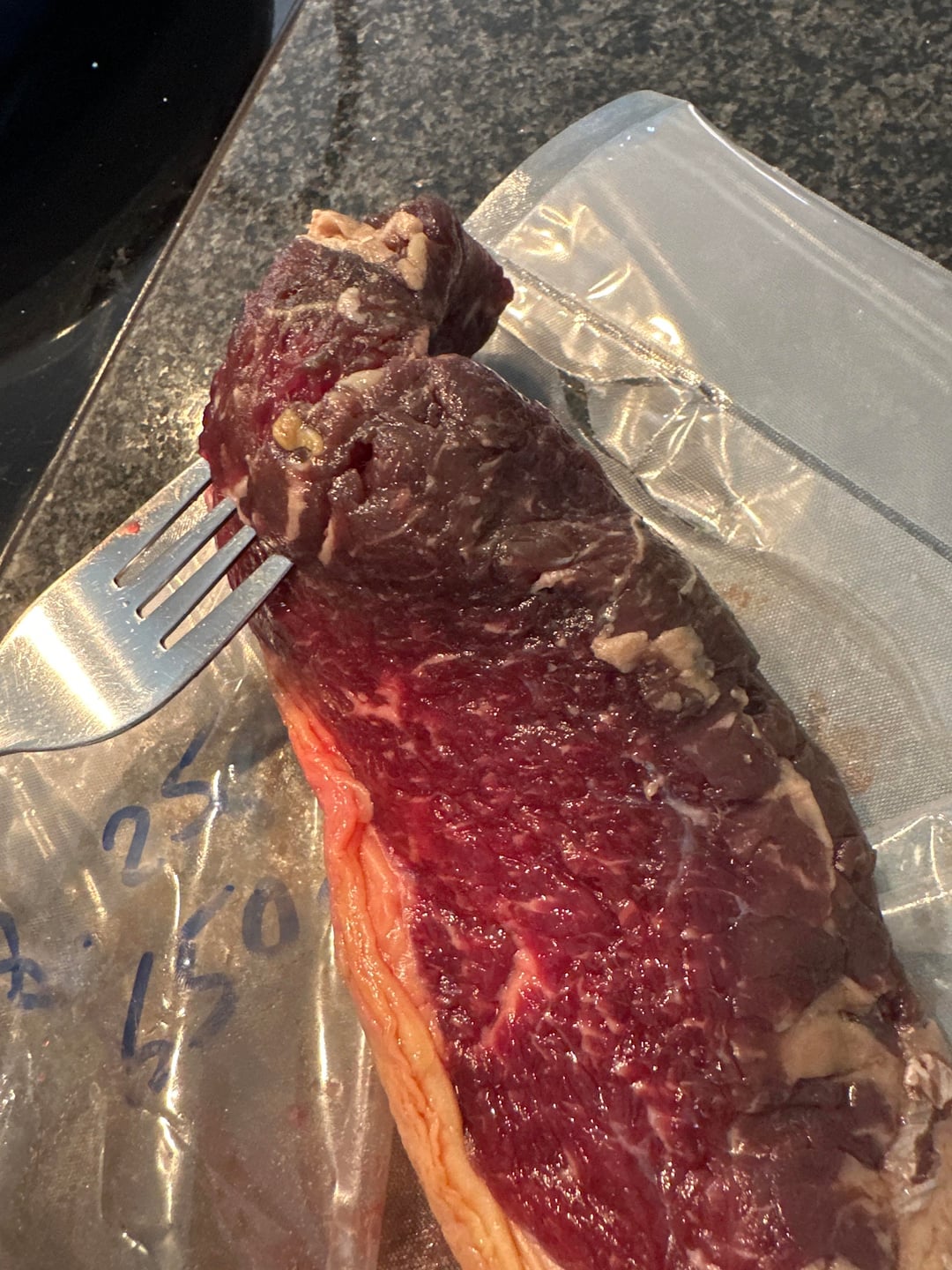 You mention a strong beefy smell – I notice that quite often especially after I’ve wet aged meat for a few weeks. Definitely doesn’t mean it’s gone bad. Spoiled beef has a smell that… well you just kinda *know*. There really isn’t a question, “not satisfying to your nose” would be a HUGE understatement. Your stomach starts to turn. I know the smell you’re describing (I think) which is kind of a strong iron/blood smell? Yeah that’s fine