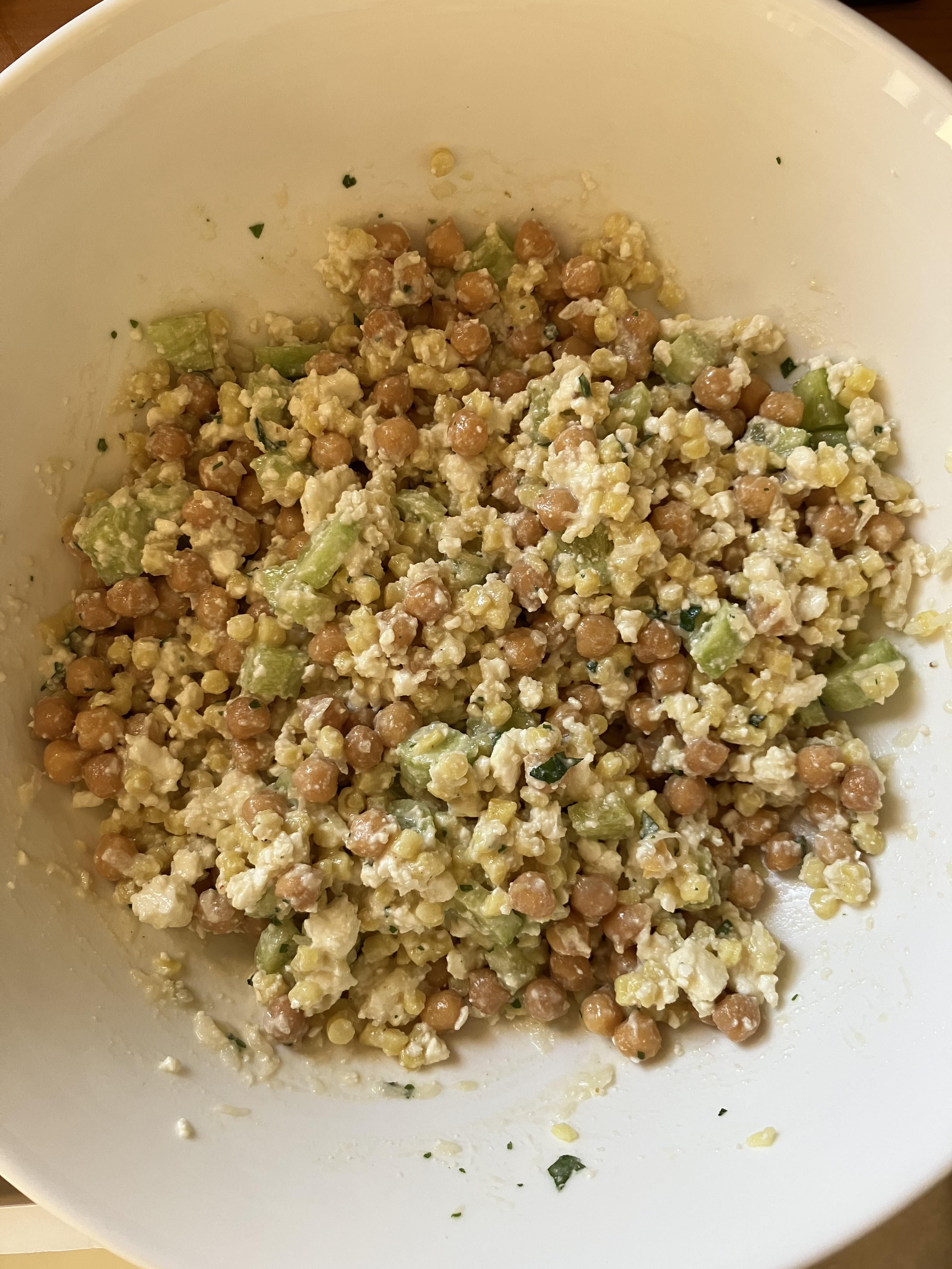 Prepared the chickpeas and couscous first, let them chill, added the cucumber, onion and feta. Then, prepared the dressing, added it on top and finally the parsley and my homegrown peppermint.