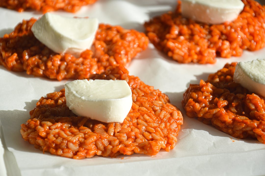 * half of a white onion * 100ml white wine * 300g Arborio rice * 500g salted vegetable broth * 400g tomato passata * 25g Parmigiano Reggiano * 230g mozzarella * 100g breadcrumbs * 1:2 ratio of flour-water * 650g sunflower oil or any other [high smoke point oil](https://www.seriouseats.com/cooking-fats-101-whats-a-smoke-point-and-why-does-it-matter) * a knob of unsalted butter * extra virgin olive oil * 20 turns of a black pepper mill * sea salt