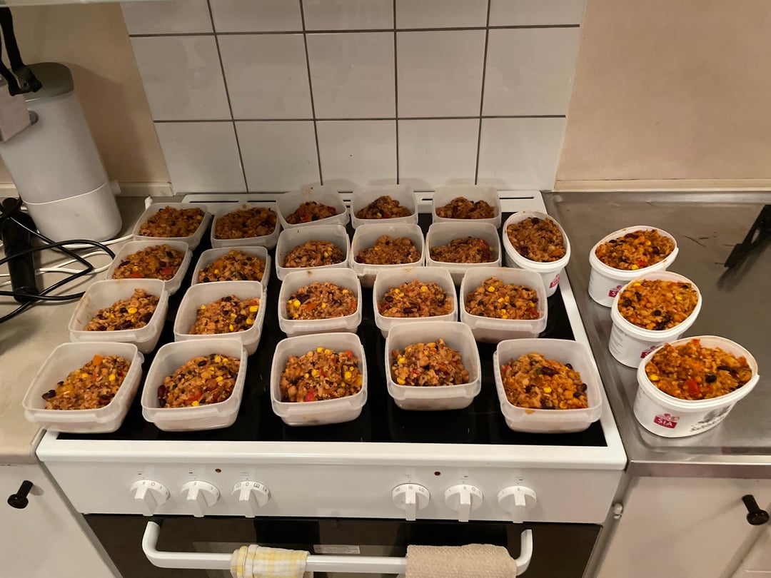 Ingredients: 500g onion 3 garlic cloves 300g bell pepers 100g celery 300g shredded carrots 400g shredded zucchini 400g frozen corn 1.000g chicken mince 500g vego mince 3 tins of white beans in tomato sauce 2 tins of kidney beans 2 tins of black beans 2 tins of chickpeas 2 dl of red quinoa (dry) 3 dl of jasmine rice (dry) 3 förp krossade tomater A couple of bouillon cubes
