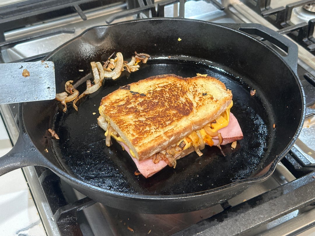 Sandwich looks amazing as is friend, but extra crispy ham is only a flip away.