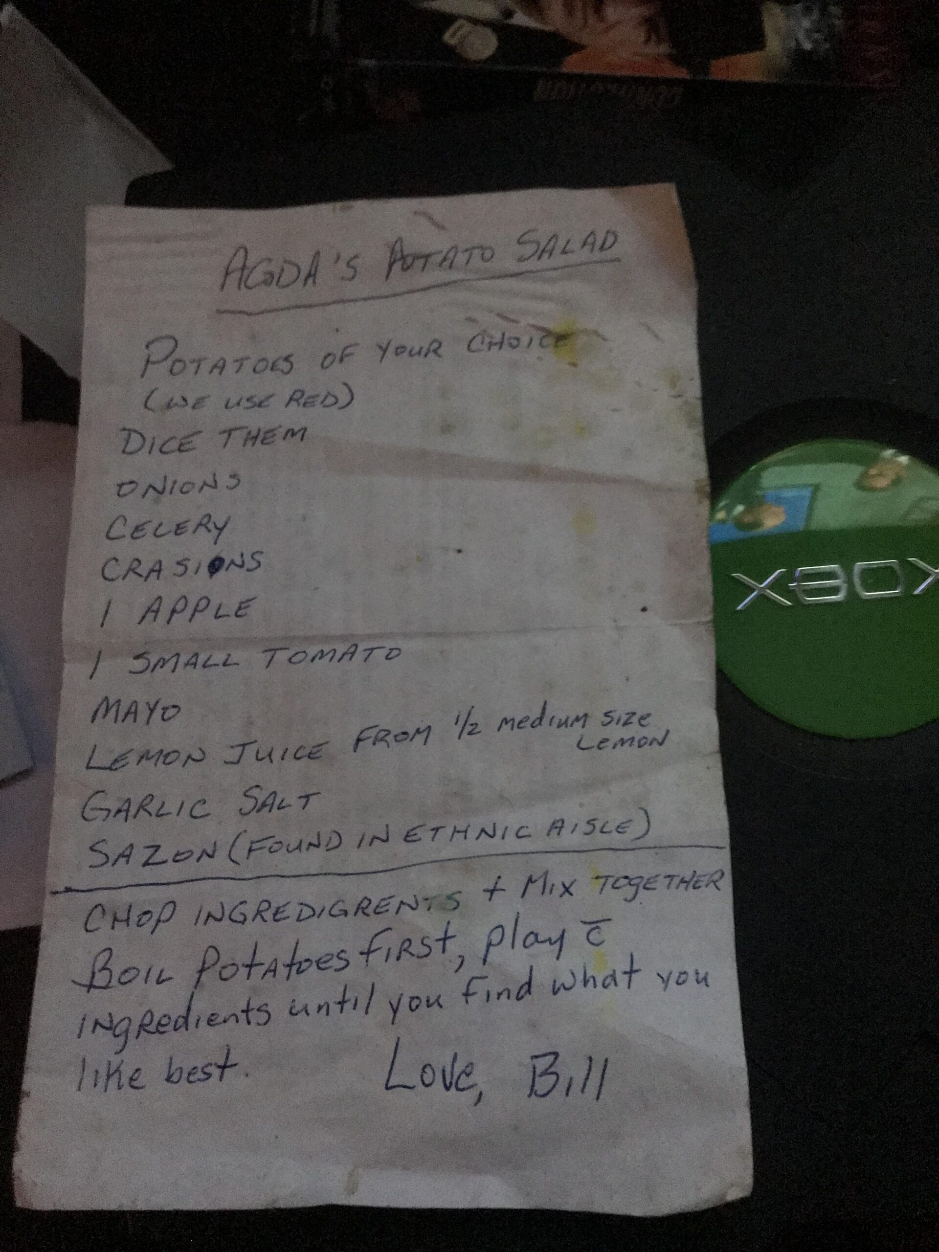 I worked for a place called Sunstar Paramedics in Largo Florida, a coworker /friend of mine named Bill one day for lunch brought in an extra helping of the potato salad & shared it with me. It was delicious, so I asked him how it was made. "my wife made it" or something to that extent.