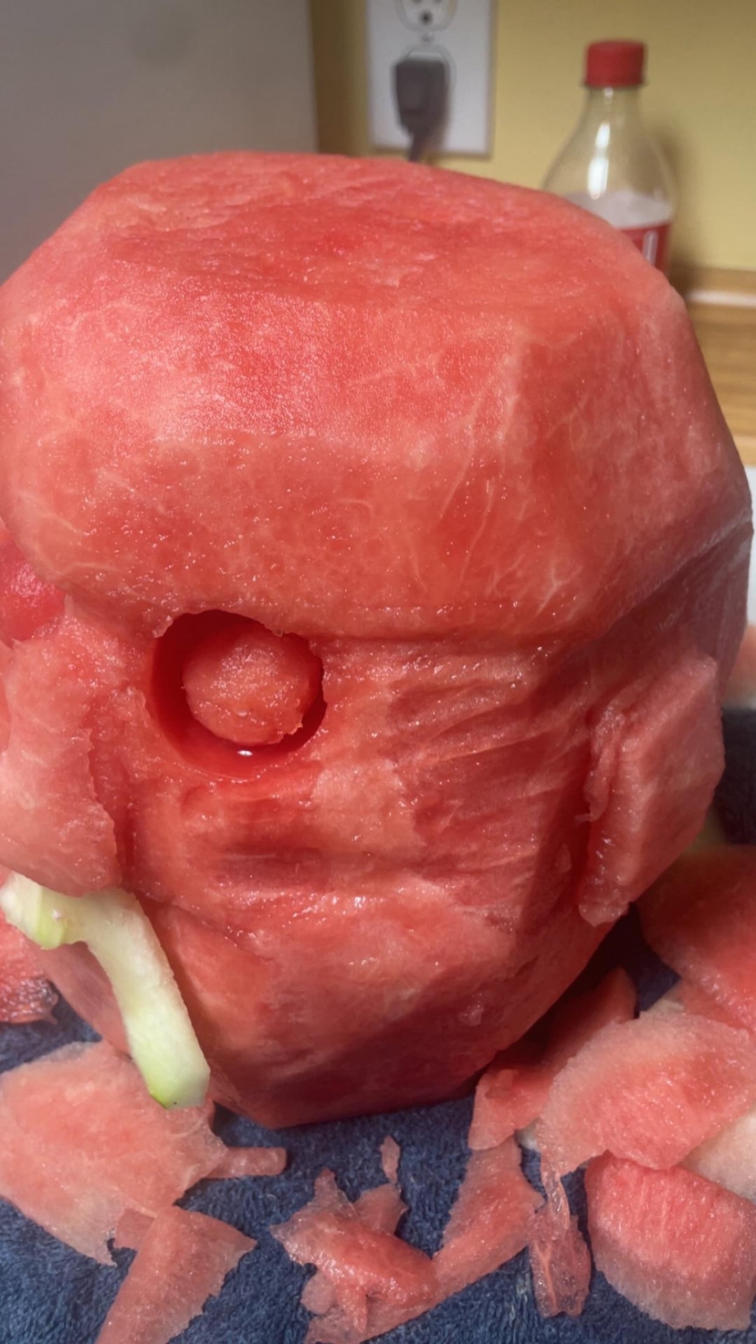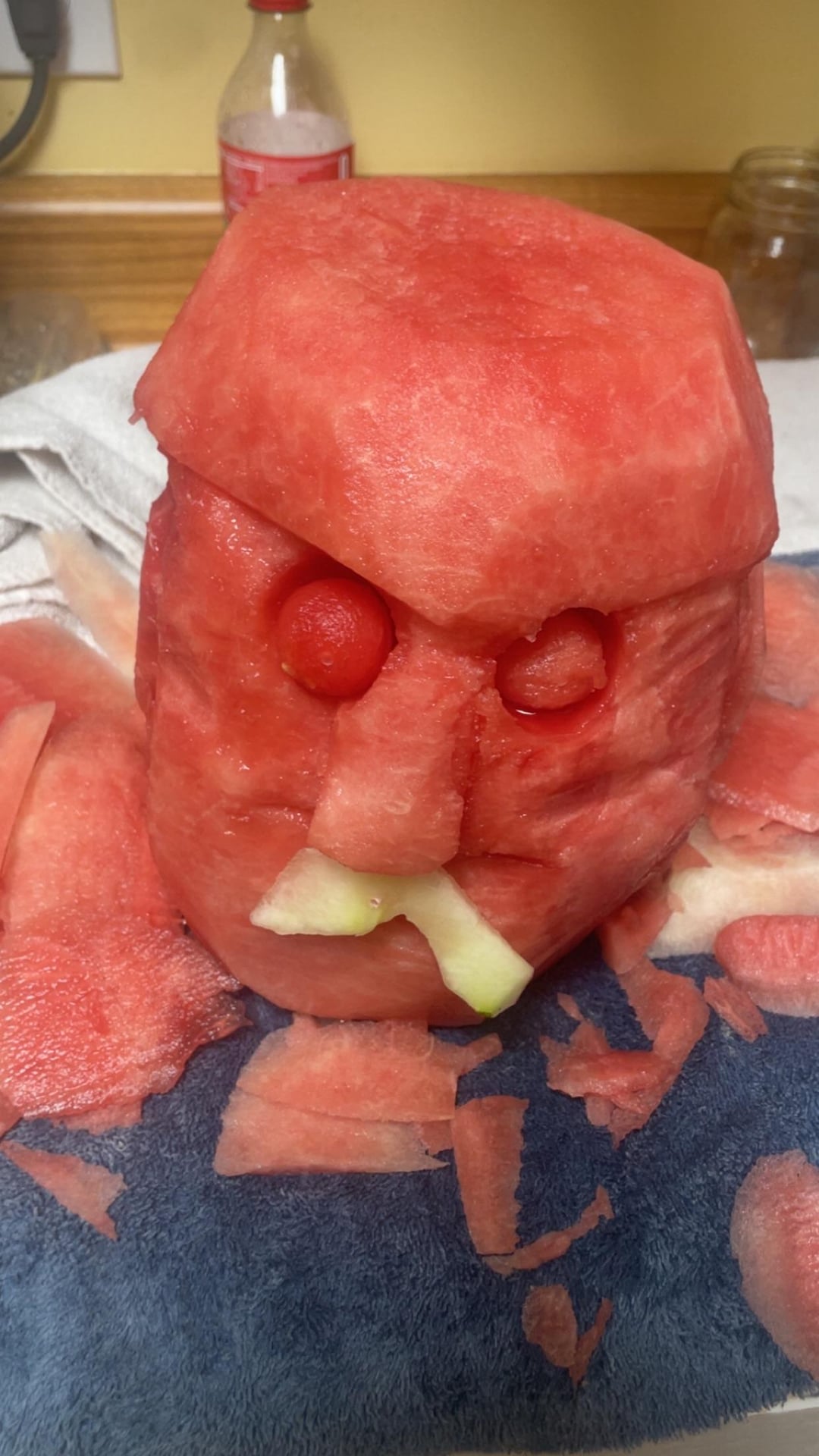 Carved a watermelon to look like my stepdad Dennis’s head so I can bite in to his skull