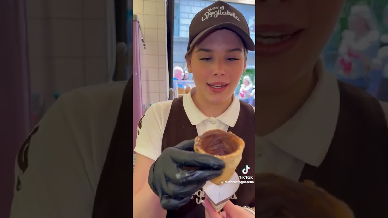 Ciao, buongiorno. Ciao, buongiorno. Ma è vero che fate il gelato nella sfogliatella? Sì, il nostro cono sfoglia. Ti posso far provare il mio preferito? Certo. Alla base il nostro cono fatto di sfogliatella. Gelato fa la sfogliatella e ora cioccolato come se non ci fosse un domani. Perché il mio preferito? Perché oltre la sfogliatella ci aggiungiamo il babà napoletano.