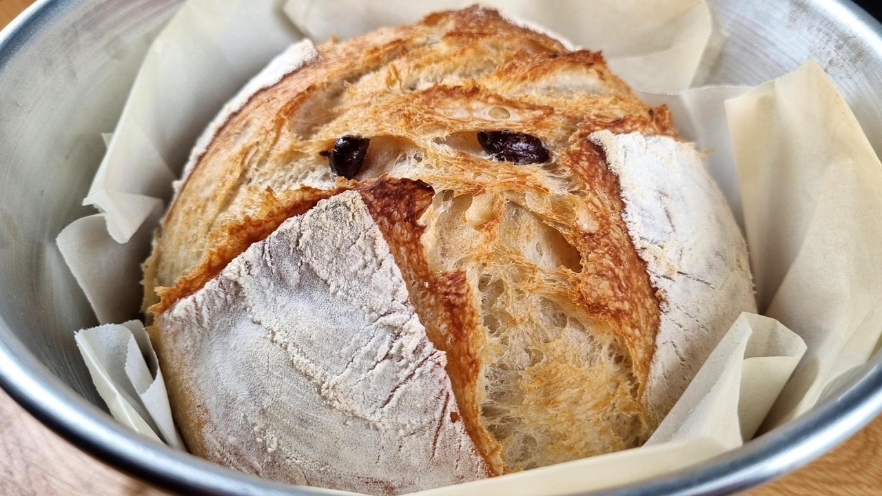 it usually takes about 2 hours Sprinkle flour on work surface Fold the dough in half Bubbles are always a good sign Gently flatten the dough into a long strip Roll tightly Roughly seal the edge Roll in the opposite direction to form a ball Use a deep pot to bake it I recommend lining the pot with baking paper Cover with a towel and let rise for 1 hour Lightly sprinkle flour over the breads Smooth the flour with your hand They’re so nice to the touch! Score the bread with a sharp blade or knife Sprinkle a little water on the sides Just a few drops to create steam Cover with a lid or another pan Bake at 430°F (220°C) for 20 minutes Take the cover off Bake for 10 more minutes What country are you watching from? Please say Hi in the comments below 🥰 I would love to hear from you 🥰 It sings while small cracks form on the crust The best song in the world! As crispy as it gets It bounces back right away Now let’s see inside What do you think? So incredibly soft! The olives add bursts of flavor I can’t get enough of it! Look how easily it tears apart A little butter is all it needs Wow, it tastes amazing! It looks great!