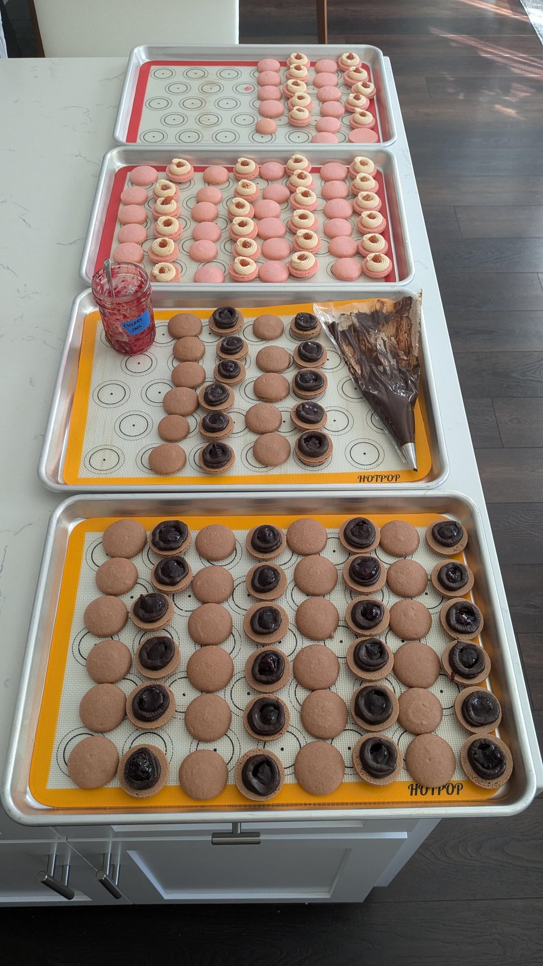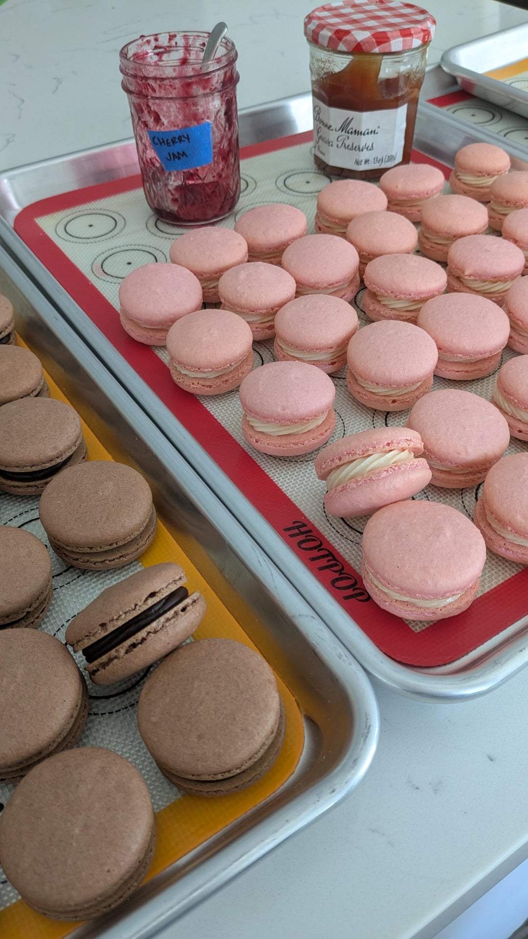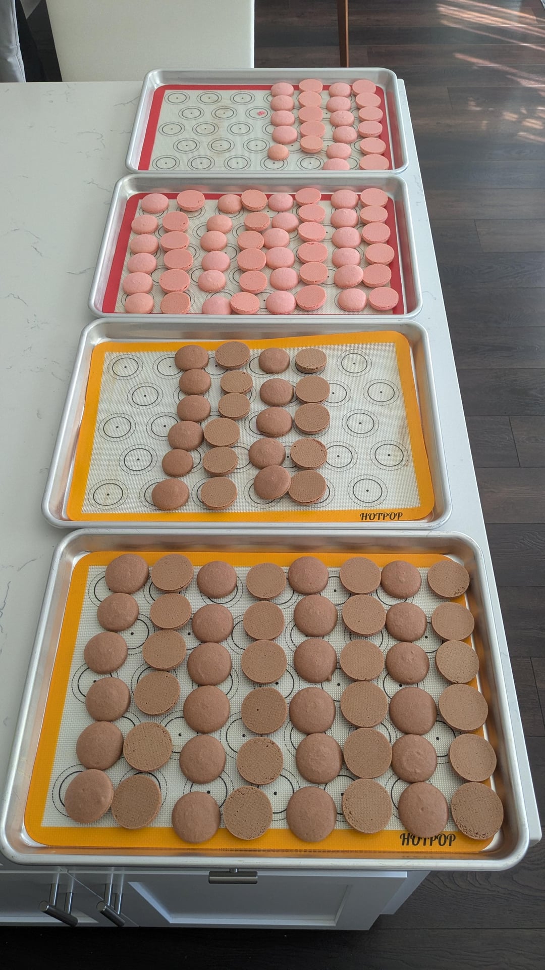 Pink shells are Fiori di Silicia with a guava buttercream and a guava preserve center (first test batch, so I might make some tweaks to make the guava pop more, but pretty good overall).
