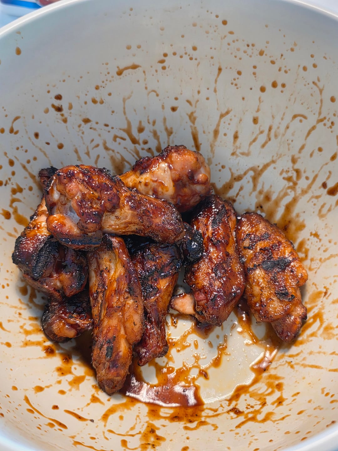 Remove from grill, set it to 375-400f, put wings in large mixing bowl, turn white with corn starch. When grill is up to temp toss them straight on the lower grate, use a spatula or tongs to toss them around until done. The white from the corn starch will be gone and they will be sizzling and crispy. I’d say typically 20 minutes gets this stage done.