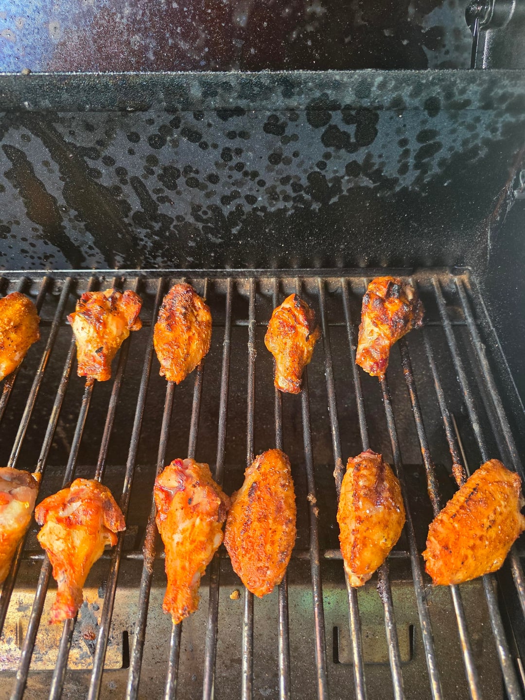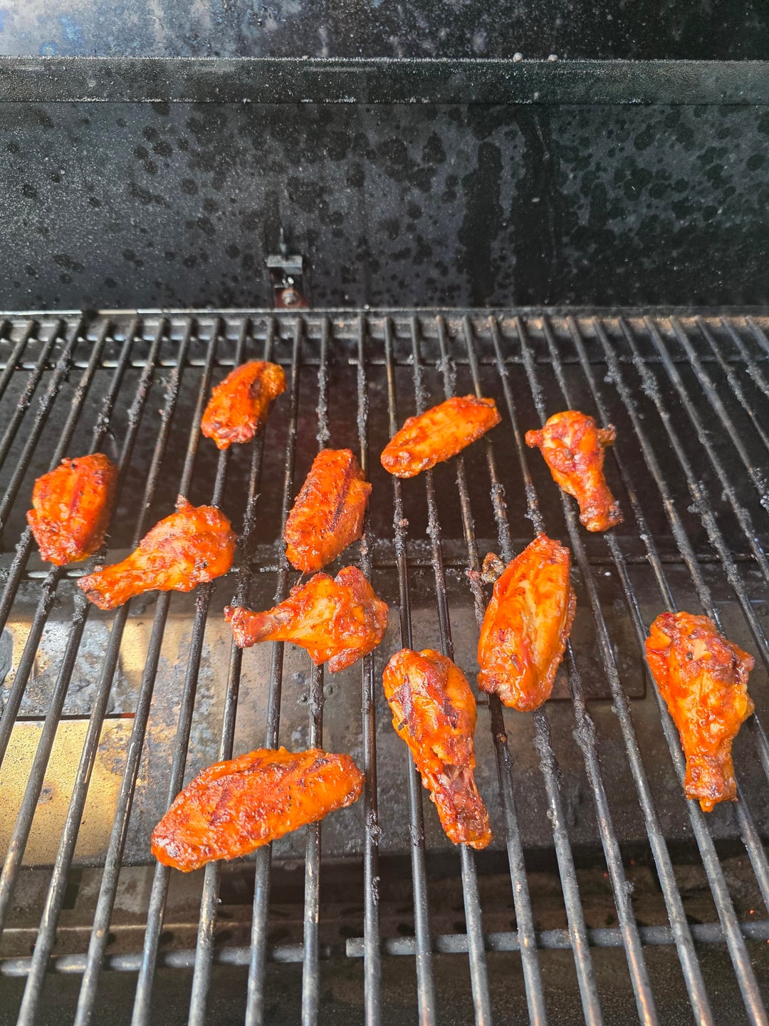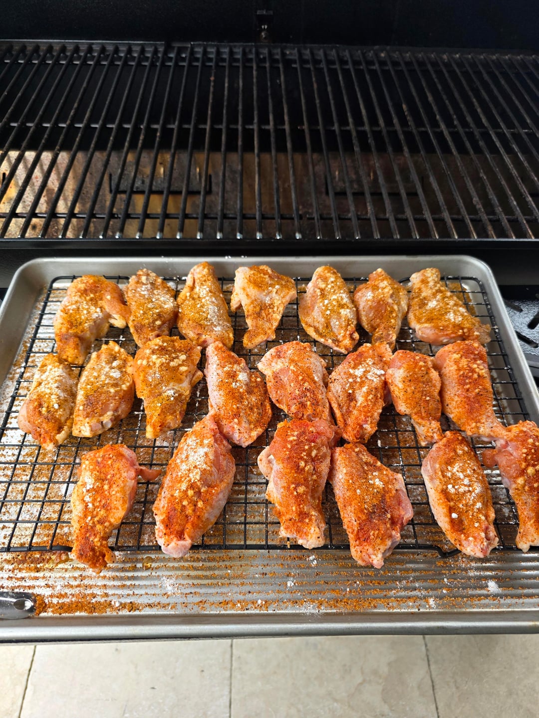 My method that I’ve shared and everyone raved about their results… use good size fresh wings not the cheap small frozen ones. Dry as much as you can. Season with rub, salt, pepper, whatever and stick in fridge a while to let them get good and dry. Set pellet smoker to 180f, lowest heaviest smoke setting. Put wings on oiled cooling racks on top shelf. Smoke low and slow 2 hours at 180f. This is important. It renders the fat down under the skin and adds the smoke flavor. They will temp around 165f at the point they are ready for the next step.