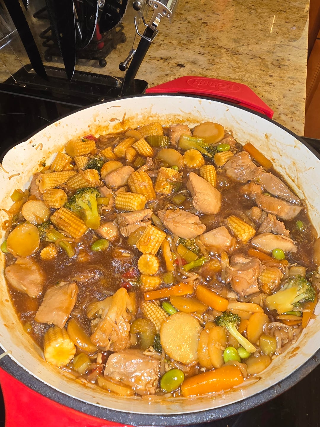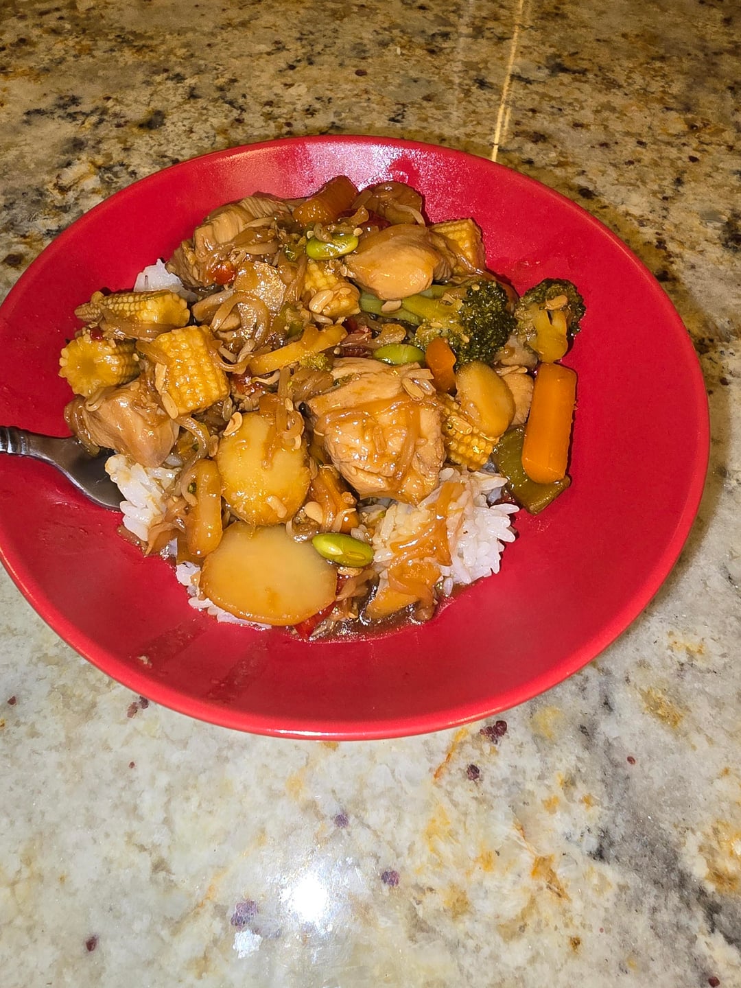 1) If the sauce is too thin so it kinda pours though the rice and pools in the bowl, you can pull all the stuff out and just blast the sauce on max heat til it tastes like it has a good intensity, then mix a bit of cornstarch with cold water to make a slurry and pour that in a bit at a time while stirring til it’s a noticeably thicker than water but not as thick as like mac n cheese sauce.