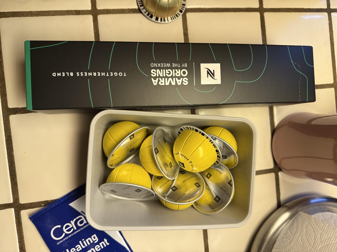 So I had about 9 coffees today — husband helped share 3 of those with me to keep my heart from blowing up. It is midnight and I am still happily wired. Nespresso is too fun.