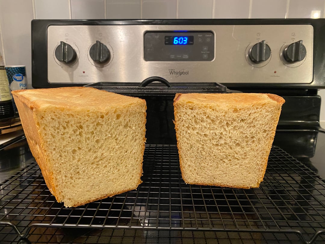 It looks great! Pullman pans are fun! Sometimes, I sprinkle sesame seeds on top during the final rise to serve as ball bearings in case I let it go too long.