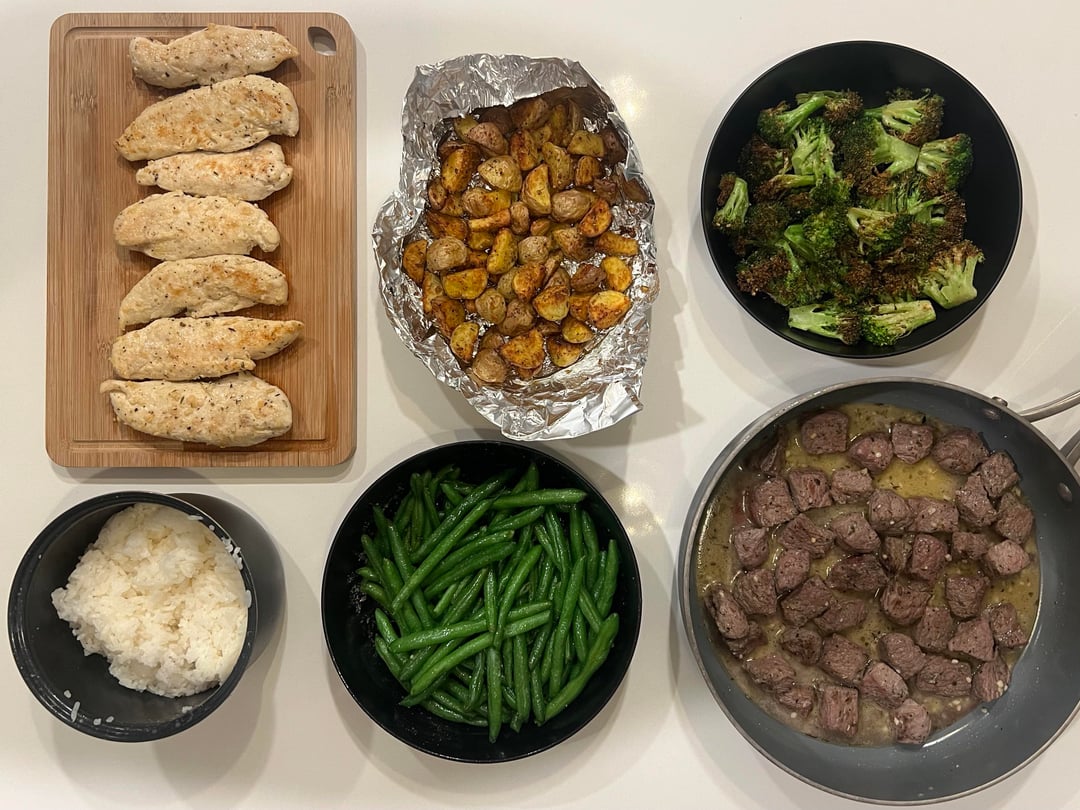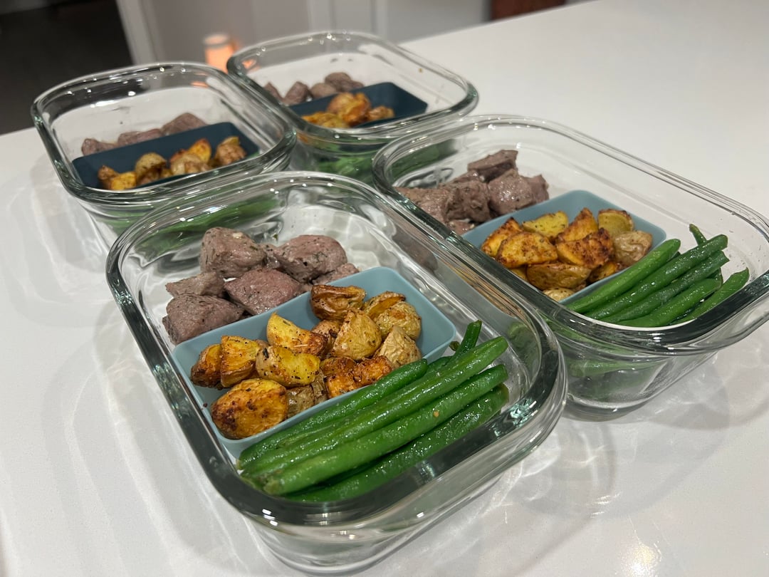 I started cooking my potatoes first. I chopped them up and coated them in olive oil, salt, pepper, garlic powder, Italian seasoning, and parmesan cheese. I air fried these on the “roast” setting at 390°f for 15 minutes, shaking every 3 minutes. For the green beans, I bought the microwaveable steam bag. I microwaved mine for 3.5 minutes, drained the water and coated the green beans in a little bit of butter, salt, and garlic powder (a little goes a long way). For the steak, I cut off the fat and cut into 1” cubes. I did a sort of “dry brine” overnight with some salt, pepper, garlic powder, and Italian seasoning. I heated some olive oil in a pan over medium heat, seared 1 side for 2 mins, added a little bit of butter & minced garlic along with Italian seasoning and flipped over to cook for an additional minute. I let them rest off the heat while I got everything else situated. Enjoy!