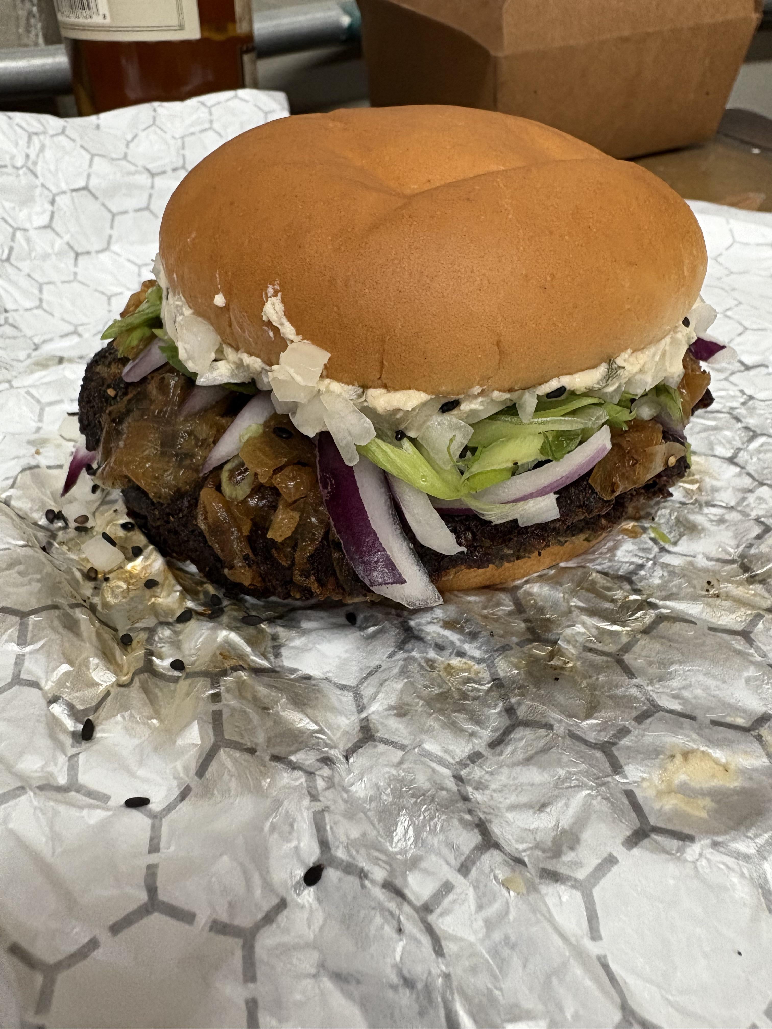 Seedy vegan smash burger (sunflower seeds, flaxseed, quinoa, spinach, mushrooms, onions), add carmelized onions, pickled jalapeños, red onions, minced red onions, and lemon tahini spread. For my onion lover <333by SpiralUniverse242424 4 Comments Character-Spinach591 2 months ago That sounds amazing. Especially with the tahini. I feel like a lot of people sleep on tahini. Brahminmeat 2 months ago Wait, sunflowers in a patty? I need this recipeI can’t eat too many legumes and I’ve been dying to cut back more on meat Dontfeedthebears 2 months ago Following for recipe, please? barontaint 2 months ago You have knock-off wendy’s burger wrappers for lunch burger purposes just chilling at home?