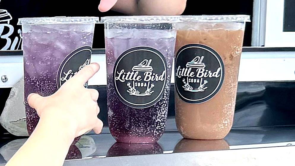 Katey McGill, who owns Little Bird Soda with her husband, Andrew McGill, serves up dirty sodas including Shark Attack, made with Sprite and blueberry and strawberry syrup. “It’s super-good,” said Nolan Folga, 8, after he tried a Shark Attack from Little Bird Soda trailer Aug. 15.