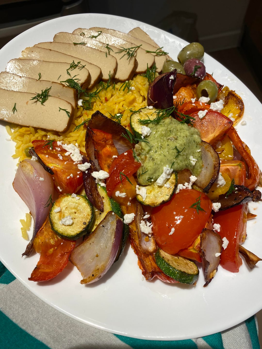 6. Smoked tofu. Turmeric rice. Medley of roasted vegetables.