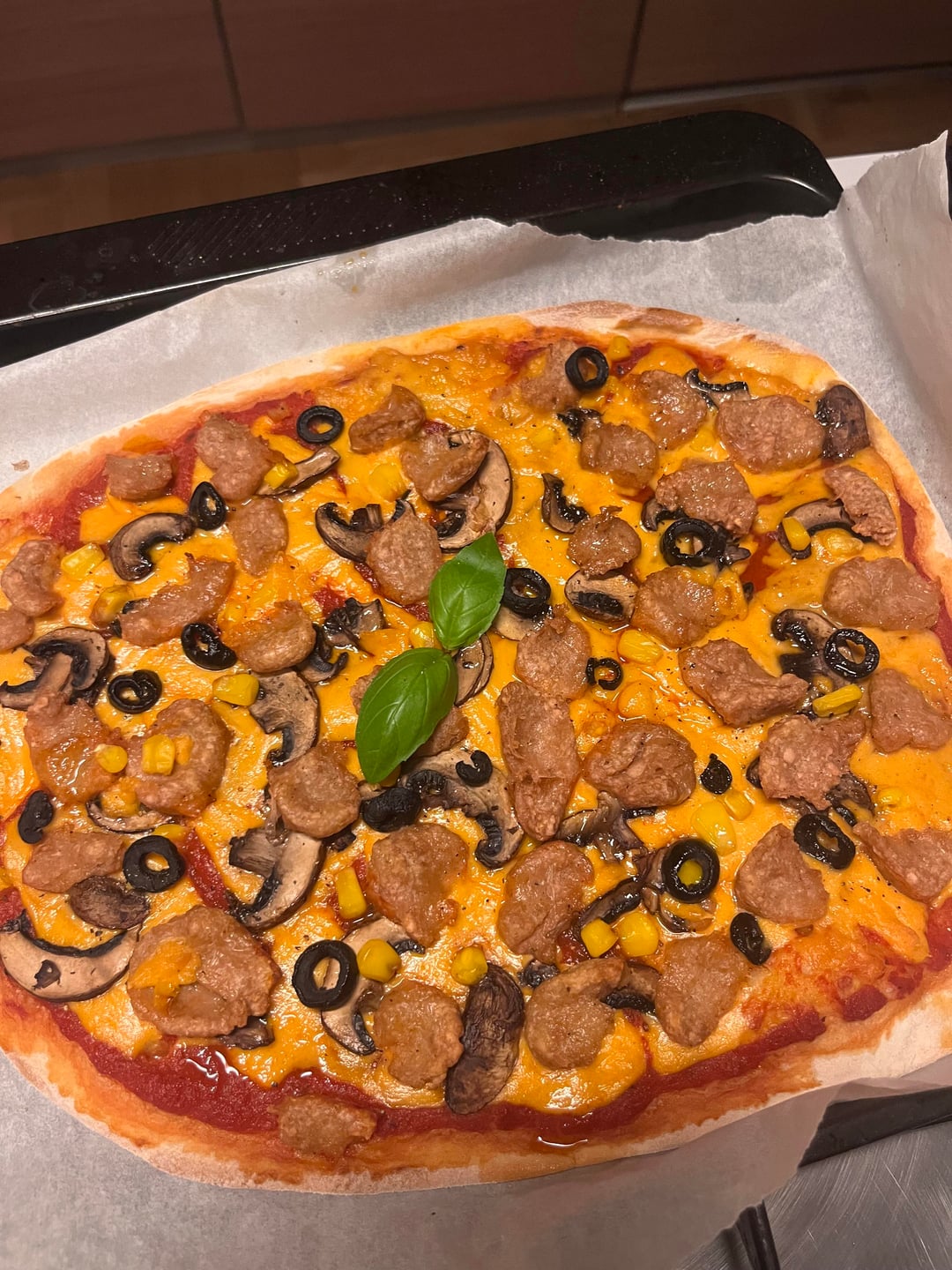 8. Pizza with mushrooms, sausages and I Am Nut Okay American cheese
