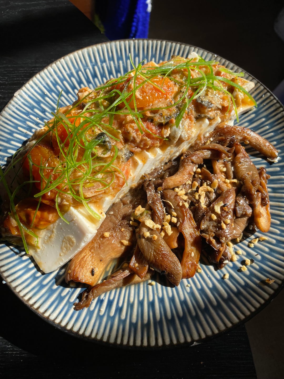 3. Silken tofu with a tomato scallion dressing. Side of oyster mushrooms