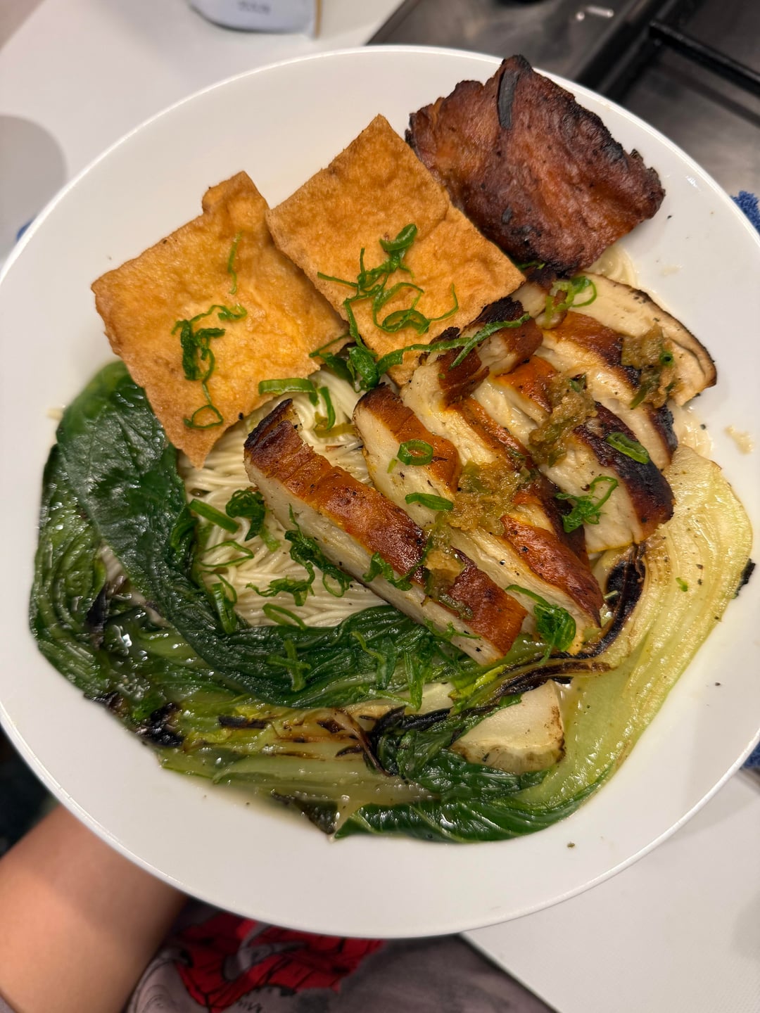 4. Mock chicken and duck cantonese style noodles with bok choy and fried tofu