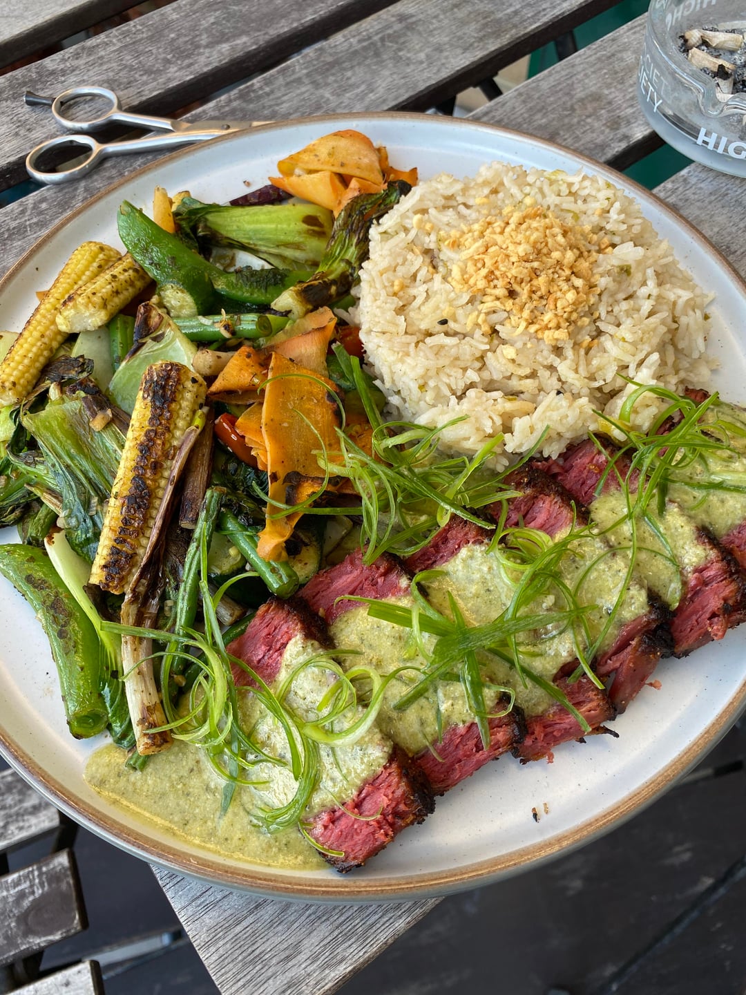 1. Juicy marble steak with a creamy pesto sauce. Stir fry with all types of colorful veg. Garlic rice.