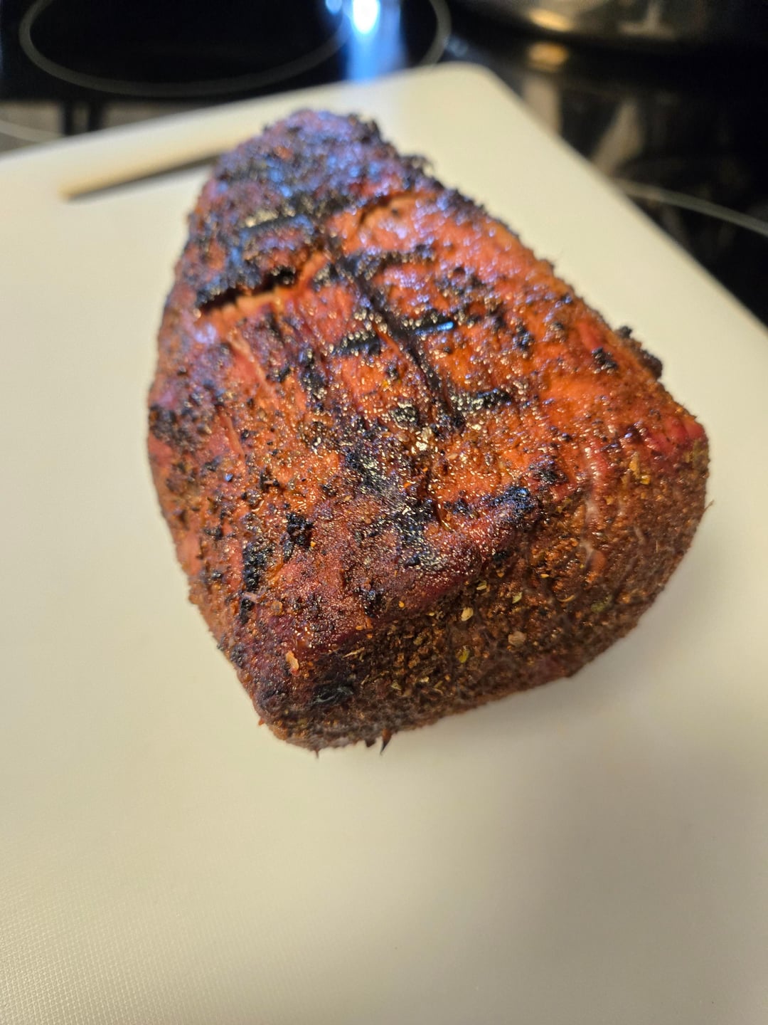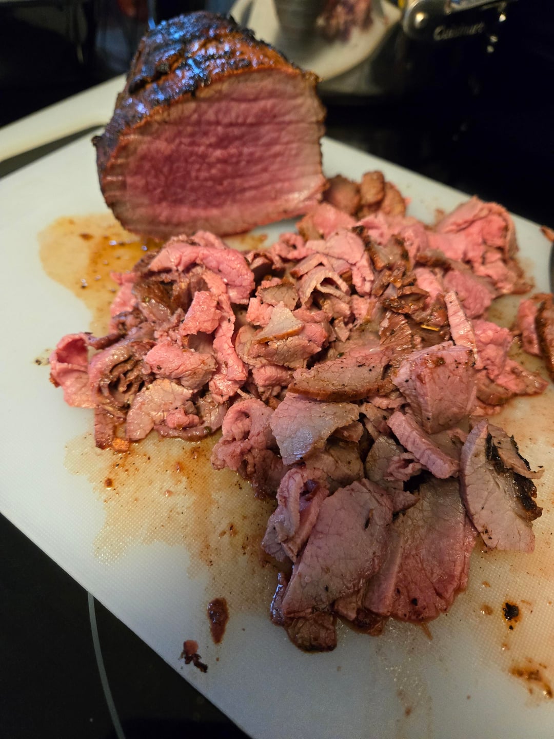 Picked up a small eye round, seasoned it and grilled it over charcoal. Sliced as thin as i can then chop it up to put on a toasted deli roll with a mixture of mayo and mustard.