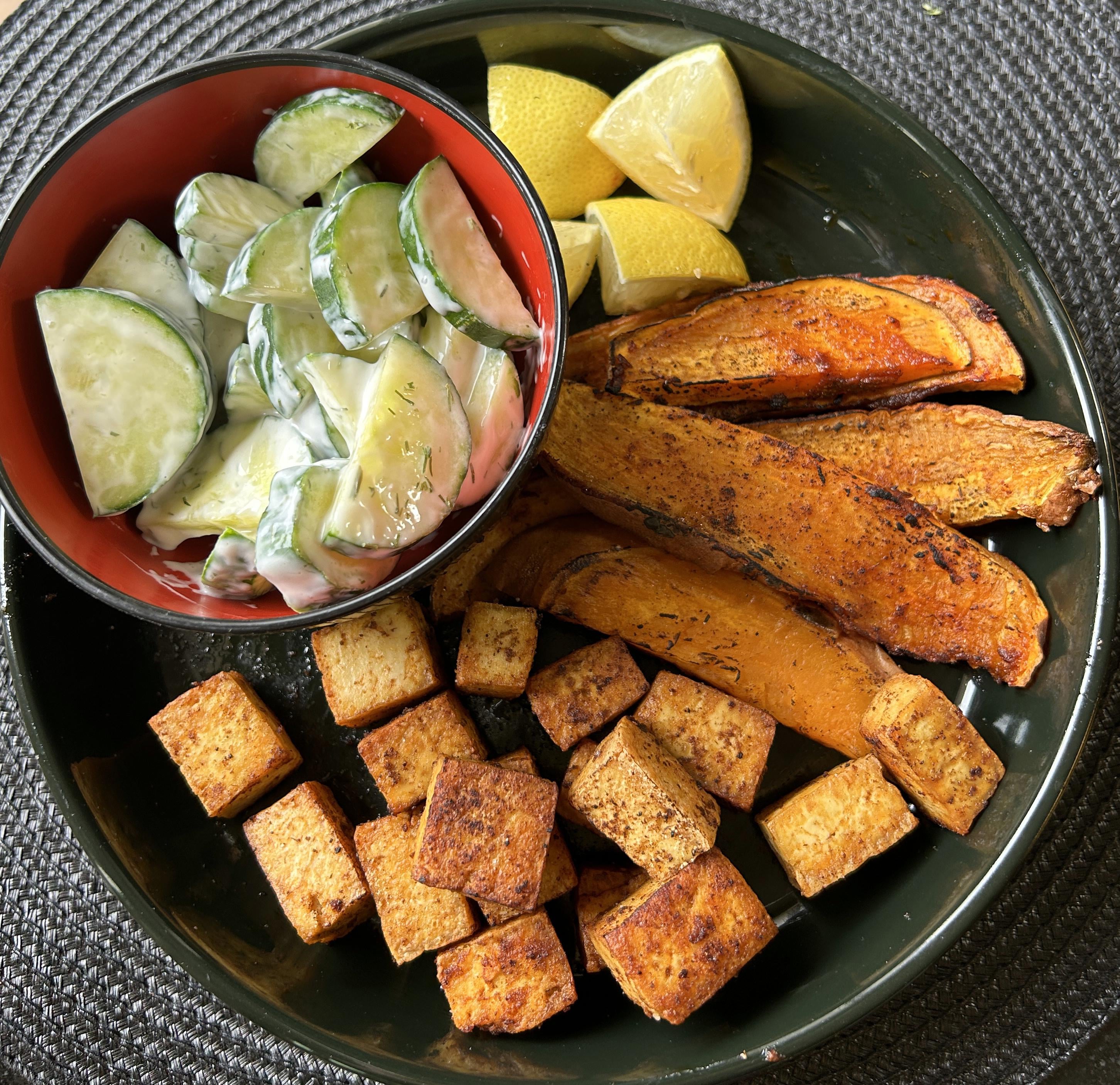 Moroccan spice is Ras el Hanout seasoning (Morton & Bassett) with harissa sauce and salt. Lemon dill cucumber salad has lemon, dill, salt, vegan plain yogurt. Inspo from Rabbit and Wolves website https://www.rabbitandwolves.com/vegan-moroccan-spiced-sheet-pan-tofu-sweet-potatoes/