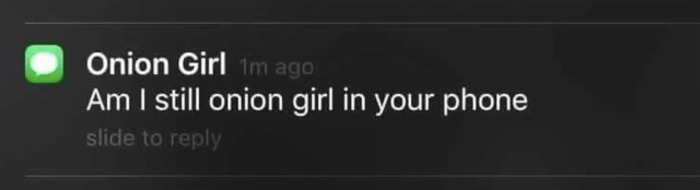 You in here, onion girl? by SousVideDiaper 5 Comments FuriousColdMiracle 2 months ago Ah yes, my favorite type of Reddit post: zero context, just a single word relating to the sub name. InflateMyProstate 2 months ago that version of iOS has to be like 9 years old at least lol retailguy_again 2 months ago “You will always be Onion Girl to me.” FireHearth 2 months ago if ur “onion girl” ur the side chick. i aspire for “onion babe” catsplants420 2 months ago I showed my husband this and told him he missed an opportunity to have this as my contact name. 😂