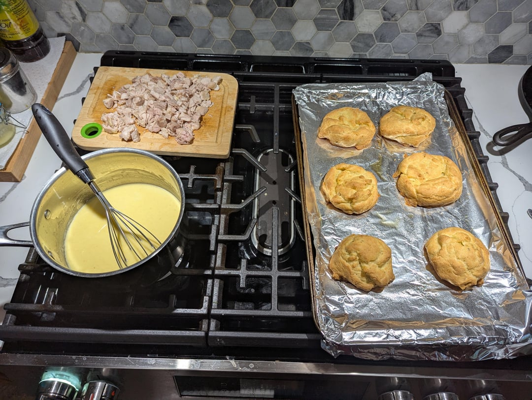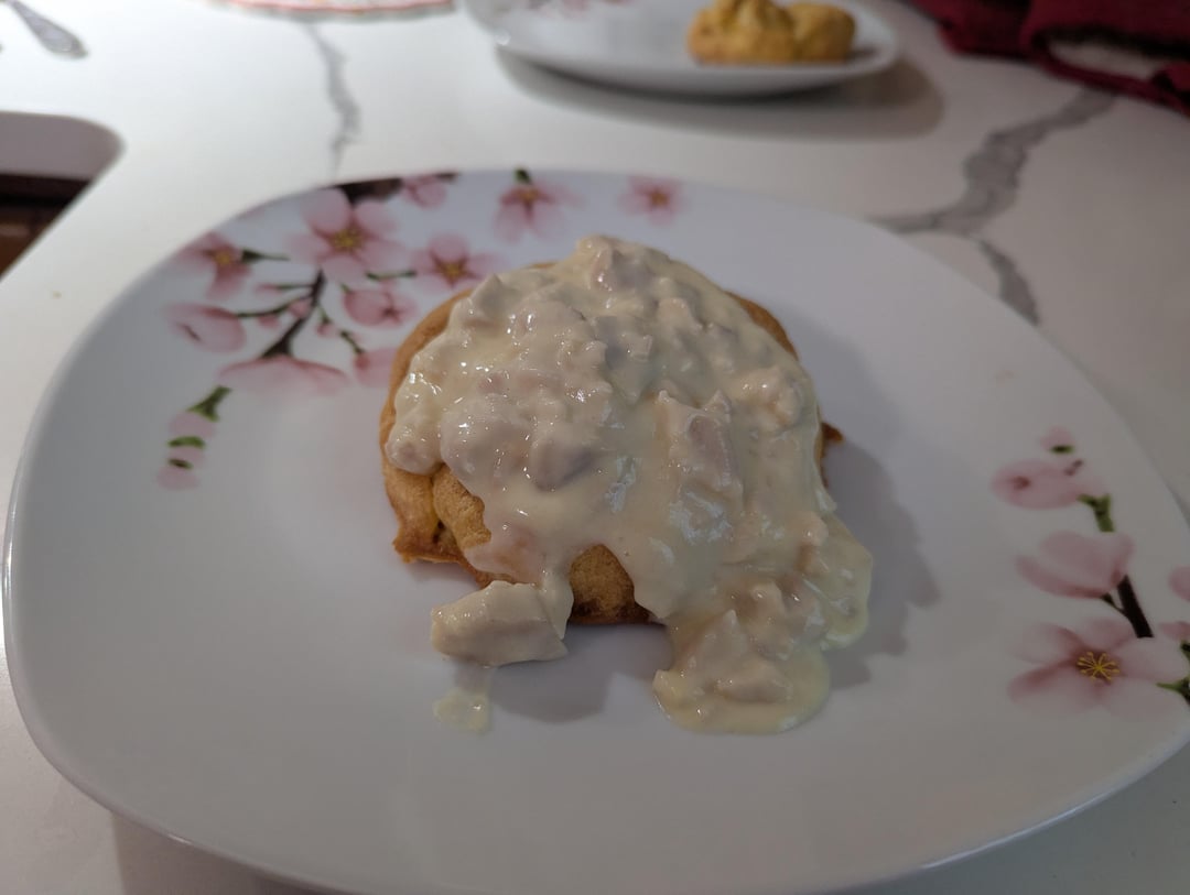 Poking the biscuits at the top caused them to deflate a little, I was not sure if that was intended or not. Either way it didn’t detract from the flavor. This recipe tasted similar to pot-pie due to the creamed chicken. Highly recommend.
