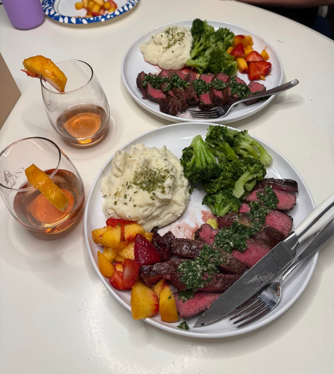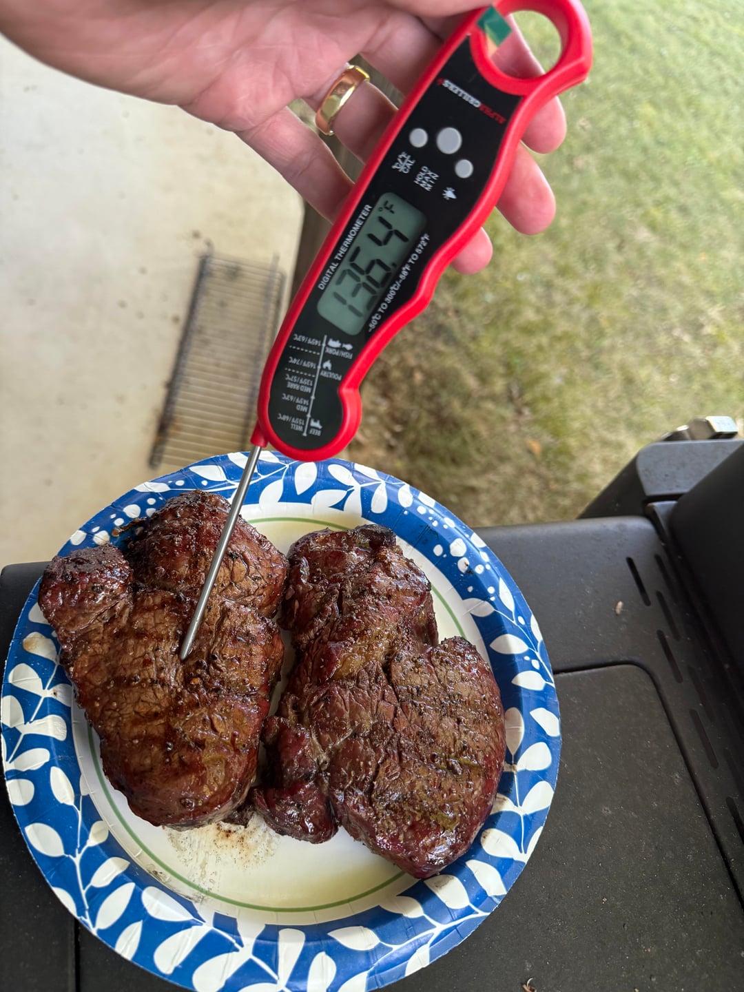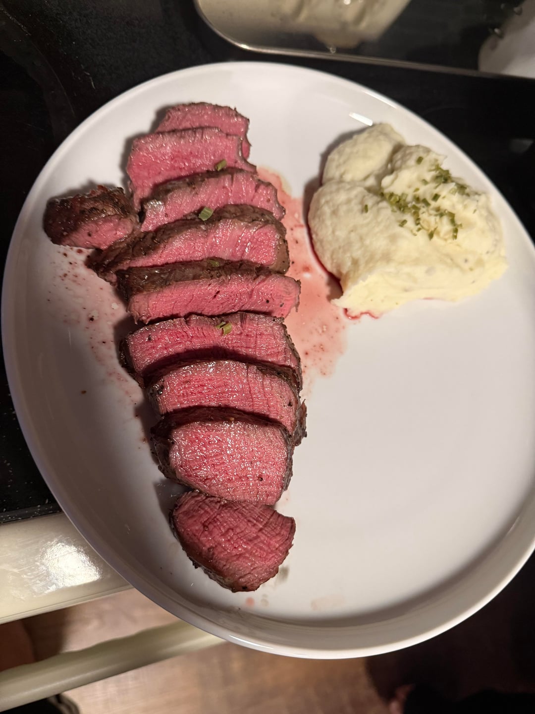 Was trying to pull off the grill sooner, got hotter internal temp than expected. Flipped every 60 seconds or so, still turned out better than I expected. I may have put a little too much garlic in the chimichurri, it was overpowering I felt. Steak was delicious!