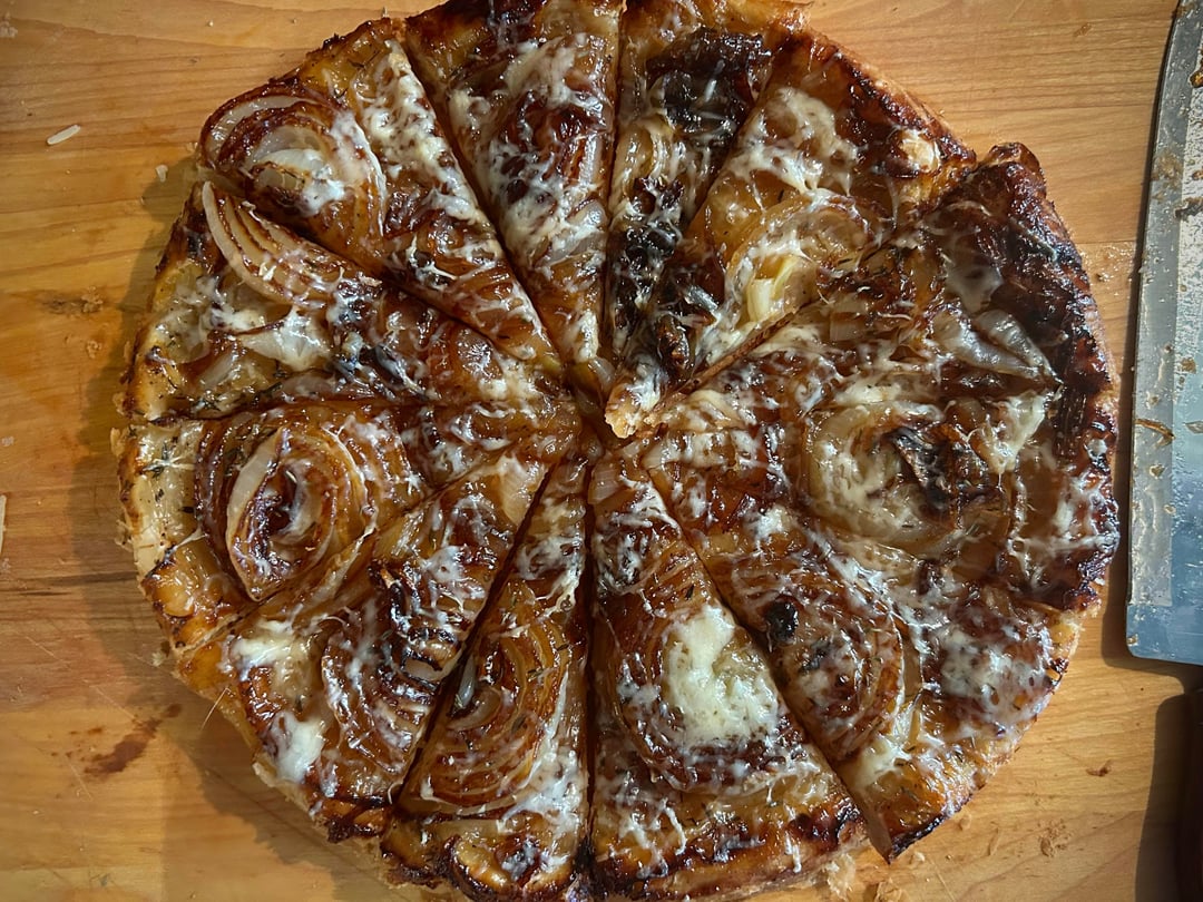 Thank you everyone!!! It was ridiculously delicious – I went by [this](https://chezlerevefrancais.com/onion-tarte-tatin/) recipe, but used vidalia onions, brown sugar instead of white, red wine vinegar instead of apple cider vinegar, and added Gruyère cheese! I want to make it again, but next time use apple brandy, sub homemade pie crust for the puff pastry, and actually use fresh thyme (I only had dried). Extra Gruyère grated fresh on top to serve!