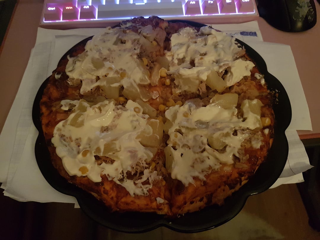 Frozen pizza with canned tuna, canned pineapple, canned corn and mayonnaise