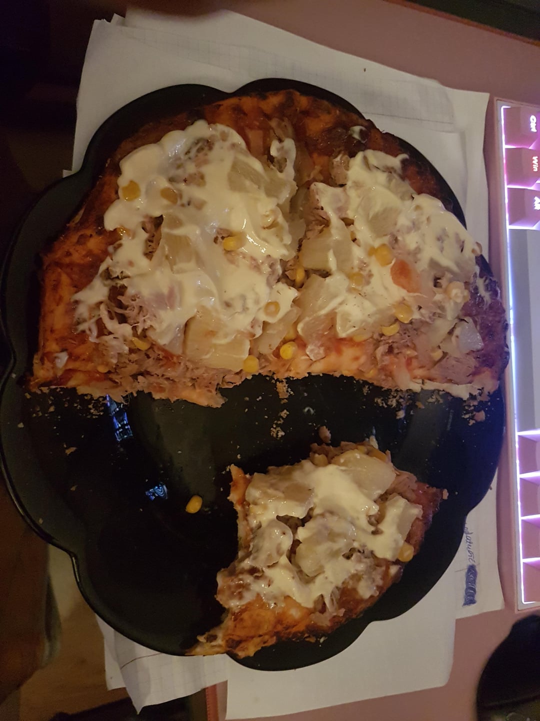 I thought it was potatoes and cheese on pizza…. It’s fucking corn pineapple mayo and tuna?
