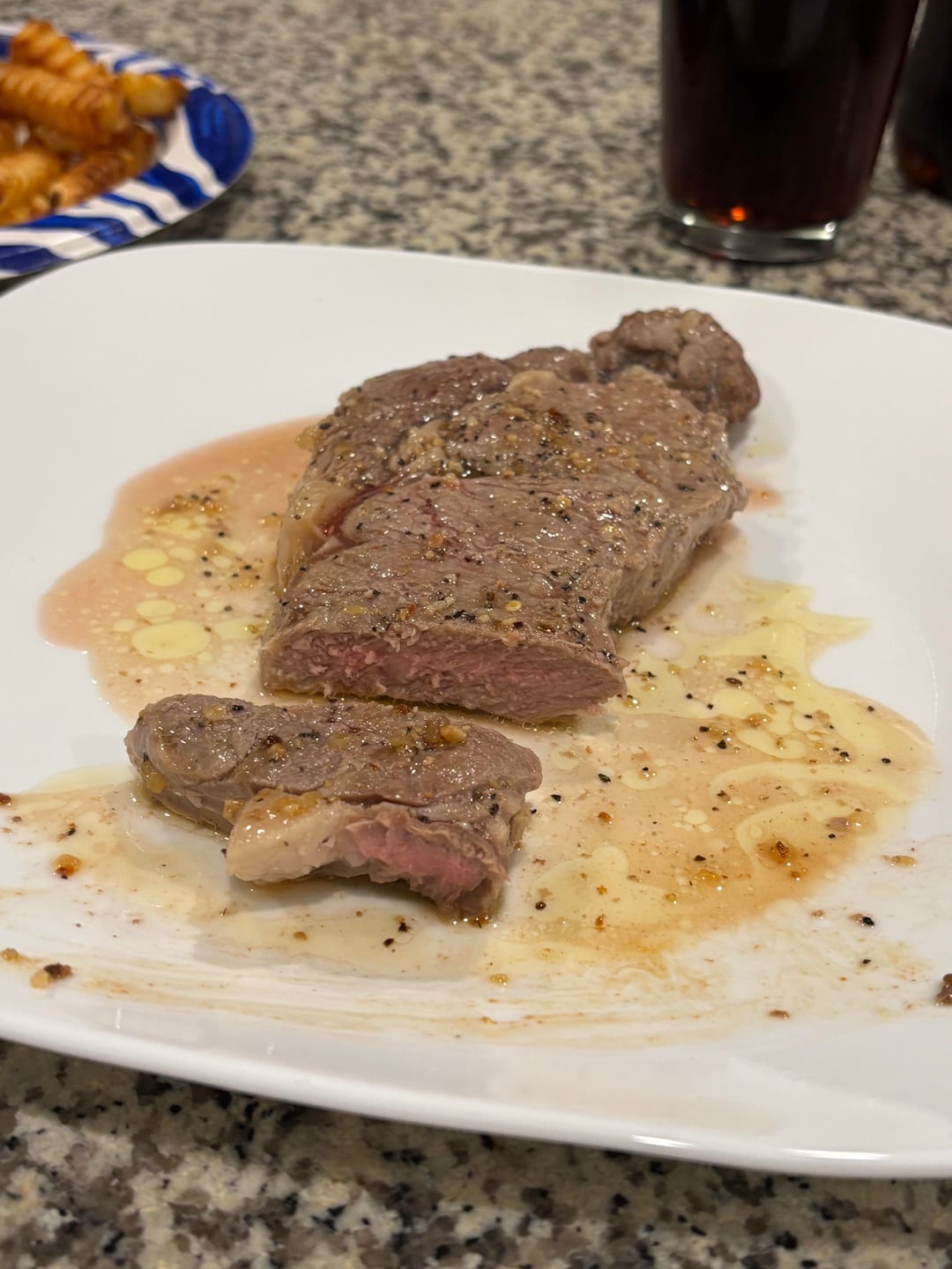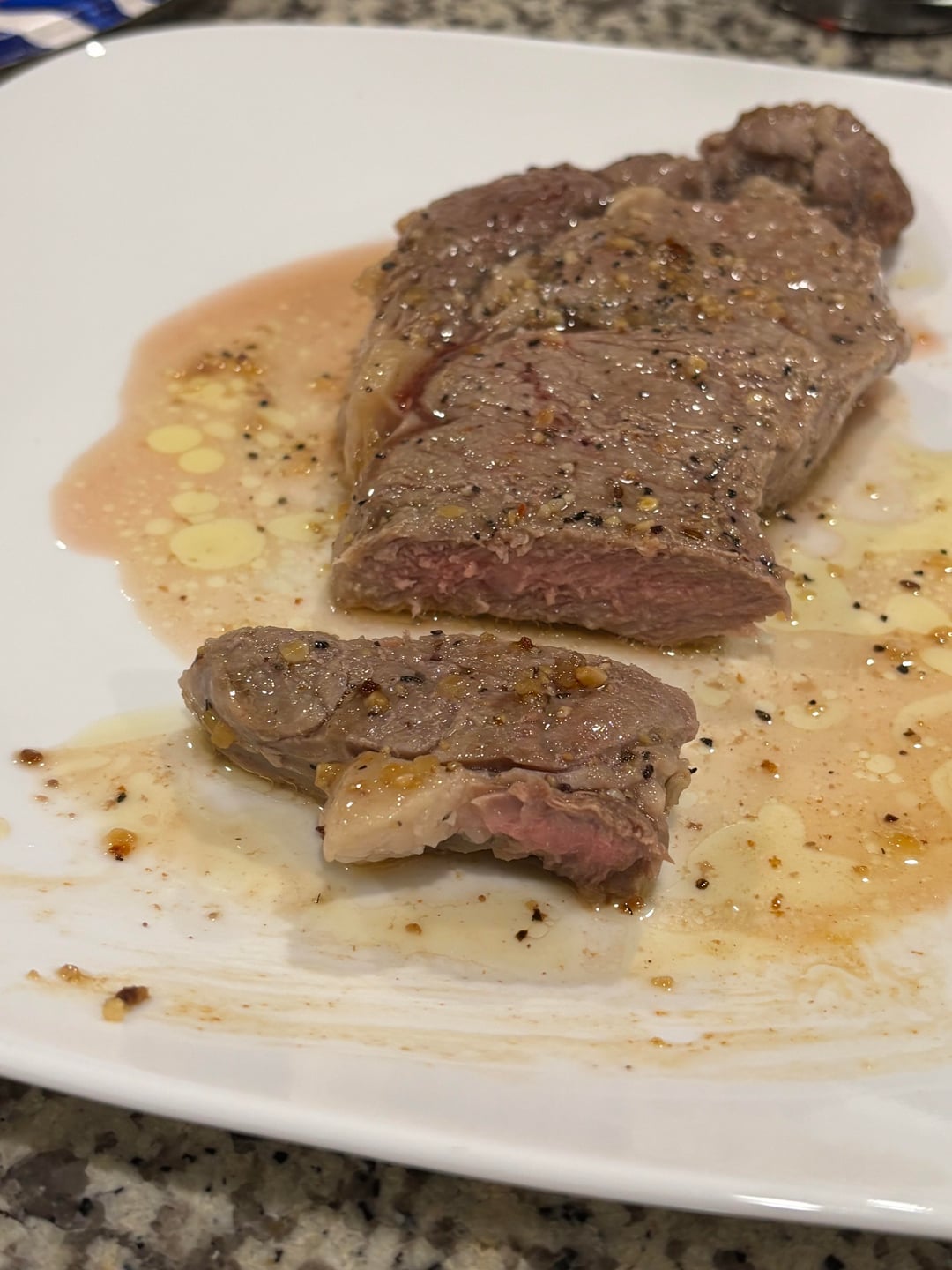 Hey all, I was the one who posted a couple days ago about trying to remedy a dry grey steak. I tried again tonight. I patted the steak dry and seasoned it. I put olive oil in the pan and let the pan get hot for 5 minutes. I had the stove set on a higher temp than last time. When the pan was nice and hot I put the steak on it and added butter to both sides. Once I seared the steak at the higher temp for one minute on each side. Then decreased the temp to a little above medium. Then flipped every 2.5 minutes. And the result was almost the same as last time.